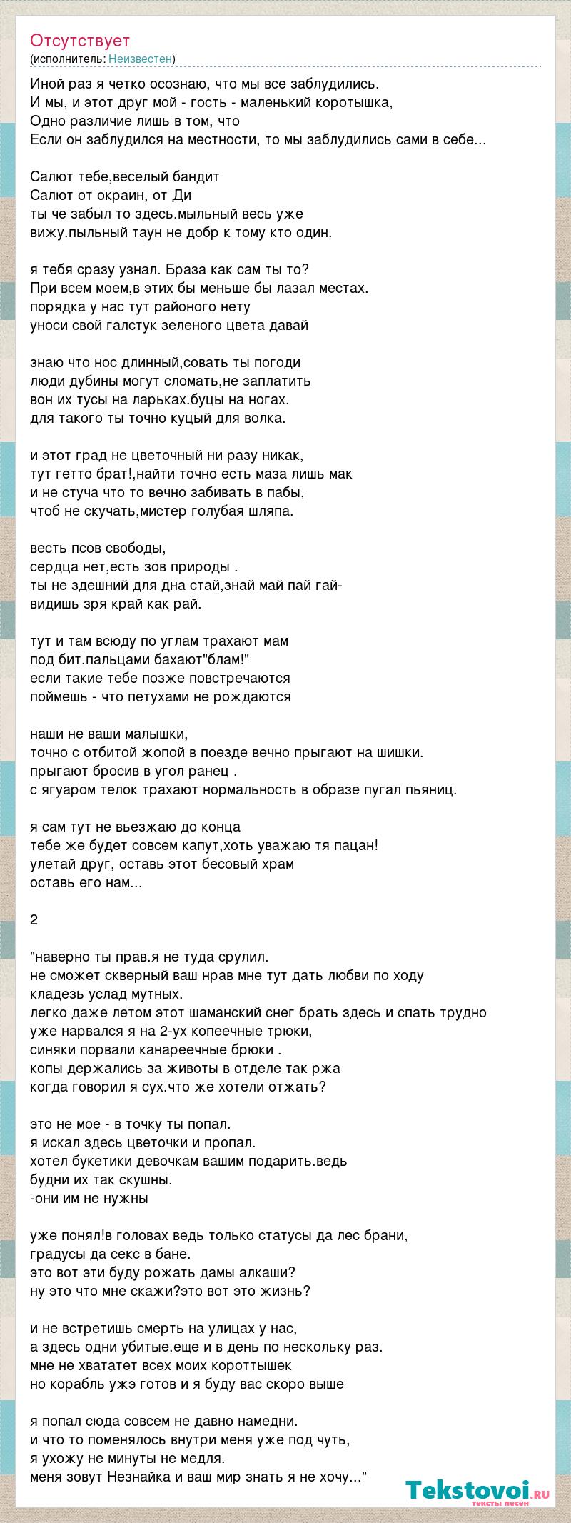 Иной раз я четко осознаю, что мы все заблудились. И мы, и этот друг мой - гость - маленький коротышка, Одно различие лишь в том, что Если он заблудился на местности, то мы заблудились сами в себе... Салют тебе,веселый бандит Салют от окраин, от Ди ты че забыл то здесь.мыльный весь уже вижу.пыльный таун не добр к тому кто один. я тебя сразу узнал. Браза как сам ты то? При всем моем,в этих бы меньше бы лазал местах. порядка у нас тут районого нету уноси свой галстук зеленого цвета давай знаю что нос длинный,совать ты погоди люди дубины могут сломать,не заплатить вон их тусы на ларьках.буцы на ногах. для такого ты точно куцый для волка. и этот град не цветочный ни разу никак, тут гетто брат!,найти точно есть маза лишь мак и не стуча что то вечно забивать в пабы, чтоб не скучать,мистер голубая шляпа. весть псов свободы, сердца нет,есть зов природы . ты не здешний для дна стай,знай май пай гай- видишь зря край как рай. тут и там всюду по углам трахают мам под бит.пальцами бахают"блам!" если такие тебе позже повстречаются поймешь - что петухами не рождаются наши не ваши малышки, точно с отбитой жопой в поезде вечно прыгают на шишки. прыгают бросив в угол ранец . с ягуаром телок трахают нормальность в образе пугал пьяниц. я сам тут не вьезжаю до конца тебе же будет совсем капут,хоть уважаю тя пацан! улетай друг, оставь этот бесовый храм оставь его нам... 2 "наверно ты прав.я не туда срулил. не сможет скверный ваш нрав мне тут дать любви по ходу кладезь услад мутных. легко даже летом этот шаманский снег брать здесь и спать трудно уже нарвался я на 2-ух копеечные трюки, синяки порвали канареечные брюки . копы держались за животы в отделе так ржа когда говорил я сух.что же хотели отжать? это не мое - в точку ты попал. я искал здесь цветочки и пропал. хотел букетики девочкам вашим подарить.ведь будни их так скушны. -они им не нужны уже понял!в головах ведь только статусы да лес брани, градусы да секс в бане. это вот эти буду рожать дамы алкаши? ну это что мне скажи?это вот это жизнь? и не встретишь смерть на улицах у нас, а здесь одни убитые.еще и в день по нескольку раз. мне не хвататет всех моих короттышек но корабль ужэ готов и я буду вас скоро выше я попал сюда совсем не давно намедни. и что то поменялось внутри меня уже под чуть, я ухожу не минуты не медля. меня зовут Незнайка и ваш мир знать я не хочу..."