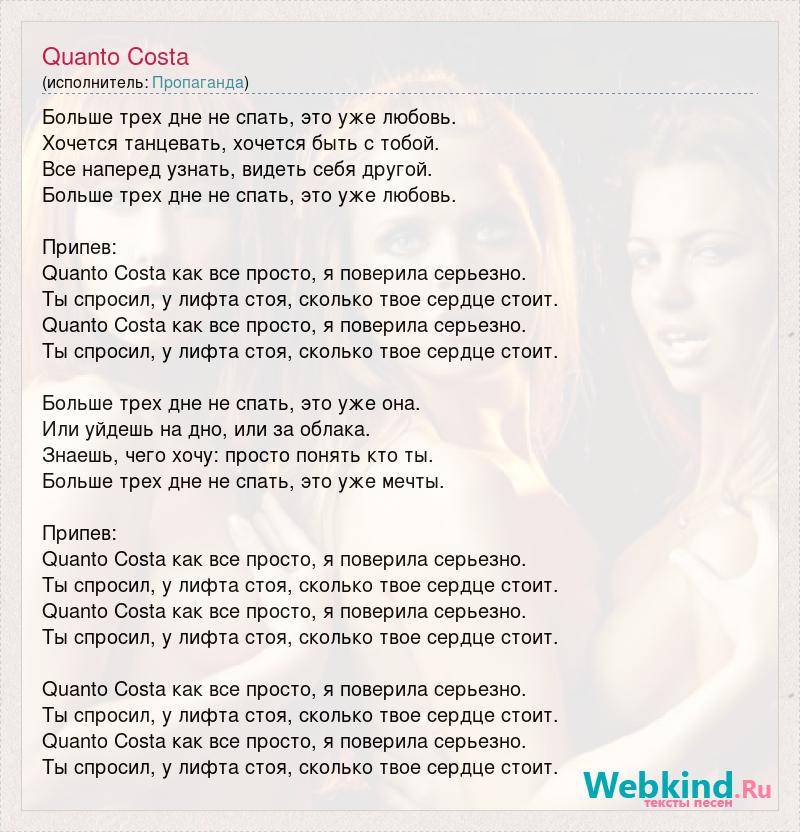 Больше трех дне не спать, это уже любовь. Хочется танцевать, хочется быть с тобой. Все наперед узнать, видеть себя другой. Больше трех дне не спать, это уже любовь. Припев: Quanto Costa как все просто, я поверила серьезно. Ты спросил, у лифта стоя, сколько твое сердце стоит. Quanto Costa как все просто, я поверила серьезно. Ты спросил, у лифта стоя, сколько твое сердце стоит. Больше трех дне не спать, это уже она. Или уйдешь на дно, или за облака. Знаешь, чего хочу: просто понять кто ты. Больше трех дне не спать, это уже мечты. Припев: Quanto Costa как все просто, я поверила серьезно. Ты спросил, у лифта стоя, сколько твое сердце стоит. Quanto Costa как все просто, я поверила серьезно. Ты спросил, у лифта стоя, сколько твое сердце стоит. Quanto Costa как все просто, я поверила серьезно. Ты спросил, у лифта стоя, сколько твое сердце стоит. Quanto Costa как все просто, я поверила серьезно. Ты спросил, у лифта стоя, сколько твое сердце стоит.