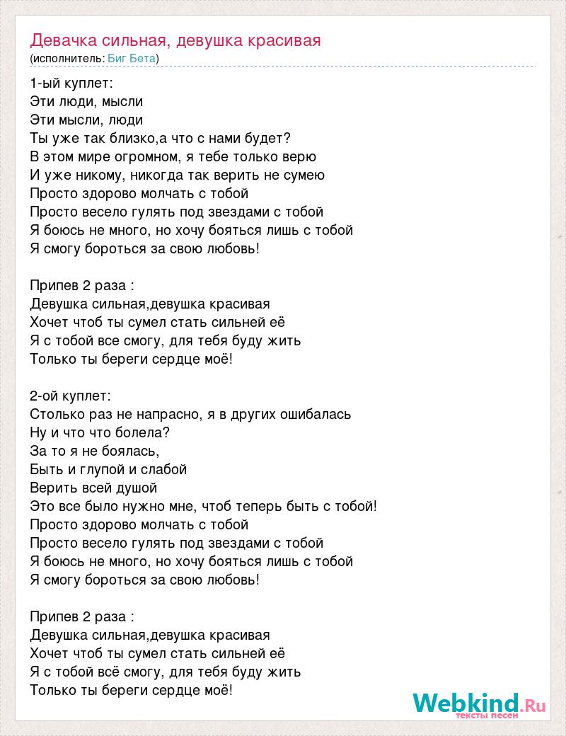1-ый куплет: Эти люди, мысли Эти мысли, люди Ты уже так близко,а что с нами будет? В этом мире огромном, я тебе только верю И уже никому, никогда так верить не сумею Просто здорово молчать с тобой Просто весело гулять под звездами с тобой Я боюсь не много, но хочу бояться лишь с тобой Я смогу бороться за свою любовь! Припев 2 раза : Девушка сильная,девушка красивая Хочет чтоб ты сумел стать сильней её Я с тобой все смогу, для тебя буду жить Только ты береги сердце моё! 2-ой куплет: Столько раз не напрасно, я в других ошибалась Ну и что что болела? За то я не боялась, Быть и глупой и слабой Верить всей душой Это все было нужно мне, чтоб теперь быть с тобой! Просто здорово молчать с тобой Просто весело гулять под звездами с тобой Я боюсь не много, но хочу бояться лишь с тобой Я смогу бороться за свою любовь! Припев 2 раза : Девушка сильная,девушка красивая Хочет чтоб ты сумел стать сильней её Я с тобой всё смогу, для тебя буду жить Только ты береги сердце моё!