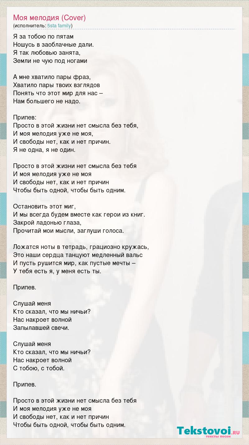 Я за тобою по пятам Ношусь в заоблачные дали. Я так любовью занята, Земли не чую под ногами А мне хватило пары фраз, Хватило пары твоих взглядов Понять что этот мир для нас – Нам большего не надо. Припев: Просто в этой жизни нет смысла без тебя, И моя мелодия уже не моя, И свободы нет, как и нет причин. Я не одна, я не один. Просто в этой жизни нет смысла без тебя И моя мелодия уже не моя И свободы нет, как и нет причин Чтобы быть одной, чтобы быть одним. Остановить этот миг, И мы всегда будем вместе как герои из книг. Закрой ладонью глаза, Прочитай мои мысли, заглуши голоса. Ложатся ноты в тетрадь, грациозно кружась, Это наши сердца танцуют медленный вальс И пусть рушится мир, как пустые мечты – У тебя есть я, у меня есть ты. Припев. Слушай меня Кто сказал, что мы ничьи? Нас накроет волной Запылавшей свечи. Слушай меня Кто сказал, что мы ничьи? Нас накроет волной С тобою, с тобой. Припев. Просто в этой жизни нет смысла без тебя И моя мелодия уже не моя И свободы нет, как и нет причин Чтобы быть одной, чтобы быть одним.