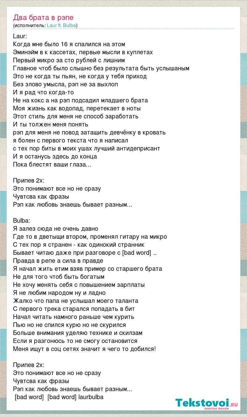 Laur: Когда мне было 16 я спалился на этом Эминэйм в к кассетах, первые мысли в куплетах Первый микро за сто рублей с лишним Главное чтоб было слышно без результата быть услышаным Это не когда ты пьян, не когда у тебя приход Без злово умысла, рэп не за выхлоп И я рад что когда-то Не на кокс а на рэп подсадил младшего брата Моя жизнь как водопад, перетекает в ноты Этот стиль для меня не способ заработать И ты толжен меня понять рэп для меня не повод затащить девчёнку в кровать я болен с первого текста что я написал с тех пор биты в моих ушах лучший антидеприсант И я останусь здесь до конца Пока блестят ваши глаза... Припев 2х: Это понимают все но не сразу Чувтсва как фразы Рэп как любовь знаешь бывает разным... Bulba: Я залез сюда не очень давно Где то в дветыщи втором, променял гитару на микро С тех пор я странен - как одинокий странник Бывает читаю даже при разговоре с [bad word] .. Правда в репе а сила в правде Я начал жить етим взяв пример со старшего брата Не для того чтоб быть богатым Не хочу менять себя с повышением зарплаты Я не любим народом ну и ладно Жалко что папа не услышал моего таланта С первого трека старался попадать в бит Начал читать намного раньше чем курить Пью но не спился курю но не скурился Больше внимания уделяю технике и скилзам Если я разгонюсь то не смогу остановится Меня ищут в соц сетях значит я чего то добился! Припев 2х: Это понимают все но не сразу Чувтсва как фразы Рэп как любовь знаешь бывает разным... [bad word] [bad word] laurbulba