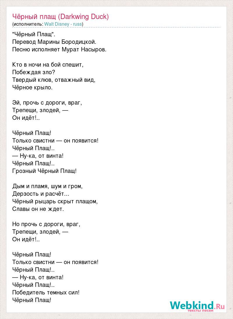 "Чёрный Плащ". Перевод Марины Бородицкой. Песню исполняет Мурат Насыров. Кто в ночи на бой спешит, Побеждая зло? Твердый клюв, отважный вид, Чёрное крыло. Эй, прочь с дороги, враг, Трепещи, злодей, — Он идёт!.. Чёрный Плащ! Только свистни — он появится! Чёрный Плащ!.. — Ну-ка, от винта! Чёрный Плащ!.. Грозный Чёрный Плащ! Дым и пламя, шум и гром, Дерзость и расчёт... Чёрный рыцарь скрыт плащом, Славы он не ждет. Но прочь с дороги, враг, Трепещи, злодей, — Он идёт!.. Чёрный Плащ! Только свистни — он появится! Чёрный Плащ!.. — Ну-ка, от винта! Чёрный Плащ!.. Победитель темных сил! Чёрный Плащ!