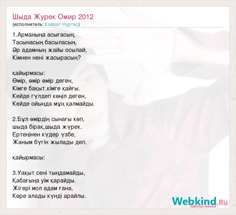 1.Арманыңа асығасың, Тасынасың басыласың. Әр адамның жайы осылай, Кімнен нені жасырасың? қайырмасы: Өмір, өмір өмір деген, Кімге бақыт,кімге қайғы. Кейде гүлдеп көңіл деген, Кейде ойыңда мұң қалмайды. 2.Бұл өмірдің сынағы көп, шыда бірақ,шыда жүрек. Ертеңінен күдер үзбе, Жаным бүгін жылады деп. қайырмасы: 3.Уақыт сені тыңдамайды, Қабағыңа уім қарайды. Жігері мол адам ғана, Көре алады күнді арайлы.