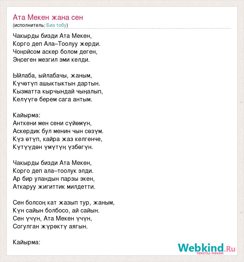 Чакырды бизди Ата Мекен, Корго деп Ала–Тоолуу жерди. Чоңойсом аскер болом деген, Эңсеген мезгил эми келди. Ыйлаба, ыйлабачы, жаным, Күчөтүп ашыктыктын дартын. Кызматта кырчындай чыңалып, Келүүгө берем сага антым. Кайырма: Анткени мен сени сүйөмүн, Аскердик бул менин чын сөзүм. Күз өтүп, кайра жаз келгенче, Күтүүдөн үмүтүң үзбөгүн. Чакырды бизди Ата Мекен, Корго деп ала–тоолук элди. Ар бир уландын парзы экен, Аткаруу жигиттик милдетти. Сен болсоң кат жазып тур, жаным, Күн сайын болбосо, ай сайын. Сен үчүн, Ата Мекен үчүн, Согулган жүрөктү аягын. Кайырма: