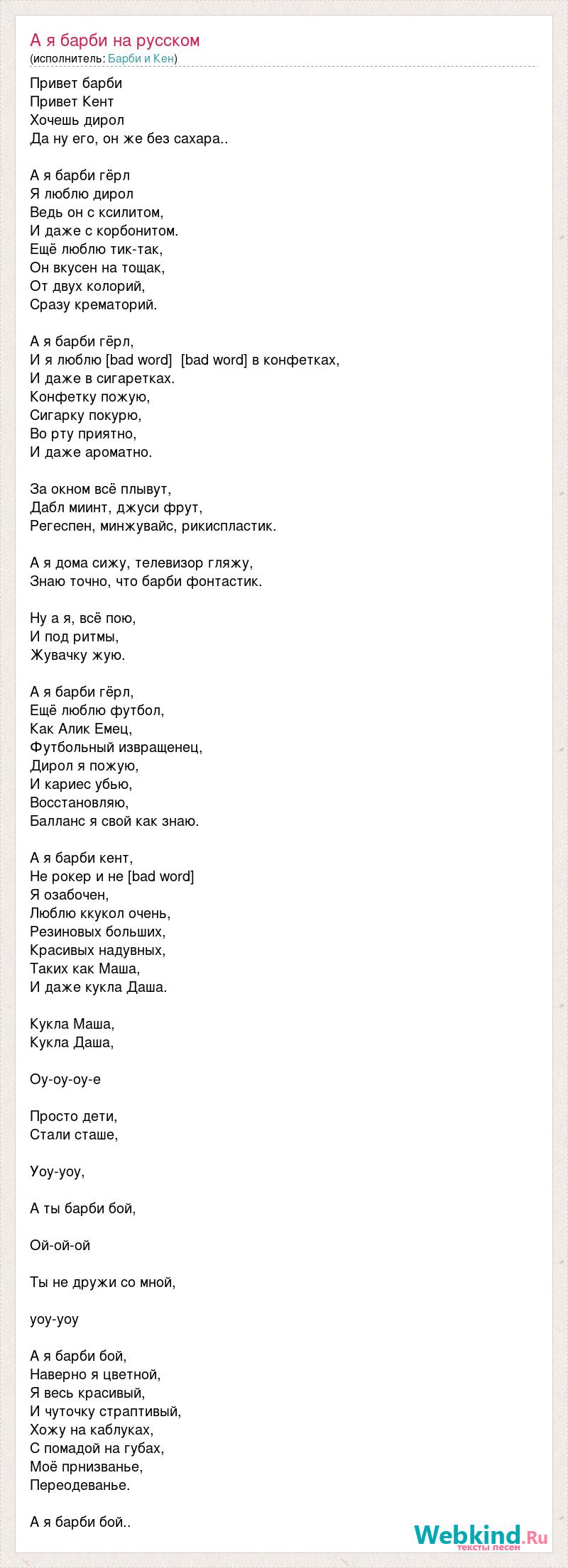 Привет барби Привет Кент Хочешь дирол Да ну его, он же без сахара.. А я барби гёрл Я люблю дирол Ведь он с ксилитом, И даже с корбонитом. Ещё люблю тик-так, Он вкусен на тощак, От двух колорий, Сразу крематорий. А я барби гёрл, И я люблю [bad word] [bad word] в конфетках, И даже в сигаретках. Конфетку пожую, Сигарку покурю, Во рту приятно, И даже ароматно. За окном всё плывут, Дабл миинт, джуси фрут, Регеспен, минжувайс, рикиспластик. А я дома сижу, телевизор гляжу, Знаю точно, что барби фонтастик. Ну а я, всё пою, И под ритмы, Жувачку жую. А я барби гёрл, Ещё люблю футбол, Как Алик Емец, Футбольный извращенец, Дирол я пожую, И кариес убью, Восстановляю, Балланс я свой как знаю. А я барби кент, Не рокер и не [bad word] Я озабочен, Люблю ккукол очень, Резиновых больших, Красивых надувных, Таких как Маша, И даже кукла Даша. Кукла Маша, Кукла Даша, Оу-оу-оу-е Просто дети, Стали сташе, Уоу-уоу, А ты барби бой, Ой-ой-ой Ты не дружи со мной, уоу-уоу А я барби бой, Наверно я цветной, Я весь красивый, И чуточку страптивый, Хожу на каблуках, С помадой на губах, Моё прнизванье, Переодеванье. А я барби бой..