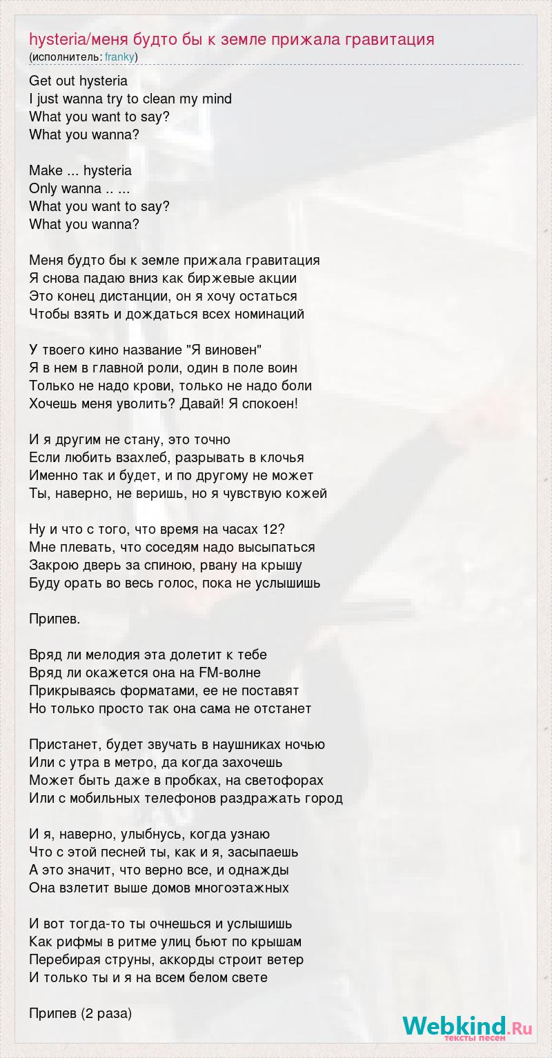Get out hysteria I just wanna try to clean my mind What you want to say? What you wanna? Make ... hysteria Only wanna .. ... What you want to say? What you wanna? Меня будто бы к земле прижала гравитация Я снова падаю вниз как биржевые акции Это конец дистанции, он я хочу остаться Чтобы взять и дождаться всех номинаций У твоего кино название "Я виновен" Я в нем в главной роли, один в поле воин Только не надо крови, только не надо боли Хочешь меня уволить? Давай! Я спокоен! И я другим не стану, это точно Если любить взахлеб, разрывать в клочья Именно так и будет, и по другому не может Ты, наверно, не веришь, но я чувствую кожей Ну и что с того, что время на часах 12? Мне плевать, что соседям надо высыпаться Закрою дверь за спиною, рвану на крышу Буду орать во весь голос, пока не услышишь Припев. Вряд ли мелодия эта долетит к тебе Вряд ли окажется она на FM-волне Прикрываясь форматами, ее не поставят Но только просто так она сама не отстанет Пристанет, будет звучать в наушниках ночью Или с утра в метро, да когда захочешь Может быть даже в пробках, на светофорах Или с мобильных телефонов раздражать город И я, наверно, улыбнусь, когда узнаю Что с этой песней ты, как и я, засыпаешь А это значит, что верно все, и однажды Она взлетит выше домов многоэтажных И вот тогда-то ты очнешься и услышишь Как рифмы в ритме улиц бьют по крышам Перебирая струны, аккорды строит ветер И только ты и я на всем белом свете Припев (2 раза)
