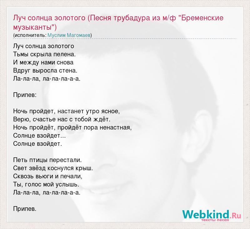 Луч солнца золотого Тьмы скрыла пелена. И между нами снова Вдруг выросла стена. Ла-ла-ла, ла-ла-ла-а-а. Припев: Ночь пройдет, настанет утро ясное, Верю, счастье нас с тобой ждёт. Ночь пройдёт, пройдёт пора ненастная, Солнце взойдет... Солнце взойдет. Петь птицы перестали. Свет звёзд коснулся крыш. Сквозь вьюги и печали, Ты, голос мой услышь. Ла-ла-ла, ла-ла-ла-а-а. Припев.