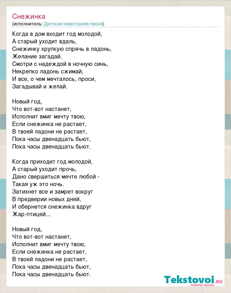 Когда в дом входит год молодой, А старый уходит вдаль, Снежинку хрупкую спрячь в ладонь, Желание загадай. Смотри с надеждой в ночную синь, Некрепко ладонь сжимай, И все, о чем мечталось, проси, Загадывай и желай. Новый год, Что вот-вот настанет, Исполнит вмиг мечту твою, Если снежинка не растает, В твоей ладони не растает, Пока часы двенадцать бьют, Пока часы двенадцать бьют. Когда приходит год молодой, А старый уходит прочь, Дано свершиться мечте любой - Такая уж это ночь. Затихнет все и замрет вокруг В предверии новых дней, И обернется снежинка вдруг Жар-птицей... Новый год, Что вот-вот настанет, Исполнит вмиг мечту твою, Если снежинка не растает, В твоей ладони не растает, Пока часы двенадцать бьют, Пока часы двенадцать бьют.