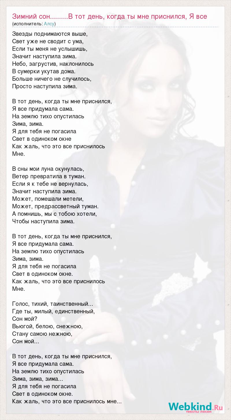 Звезды поднимаются выше, Свет уже не сводит с ума, Если ты меня не услышишь, Значит наступила зима. Небо, загрустив, наклонилось В сумерки укутав дома. Больше ничего не случилось, Просто наступила зима. В тот день, когда ты мне приснился, Я все придумала сама. На землю тихо опустилась Зима, зима. Я для тебя не погасила Свет в одиноком окне Как жаль, что это все приснилось Мне. В сны мои луна окунулась, Ветер превратила в туман. Если я к тебе не вернулась, Значит наступила зима. Может, помешали метели, Может, предрассветный туман. А помнишь, мы с тобою хотели, Чтобы наступила зима. В тот день, когда ты мне приснился, Я все придумала сама. На землю тихо опустилась Зима, зима. Я для тебя не погасила Свет в одиноком окне. Как жаль, что это все приснилось Мне. Голос, тихий, таинственный... Где ты, милый, единственный, Сон мой? Вьюгой, белою, снежною, Стану самою нежною, Сон мой... В тот день, когда ты мне приснился, Я все придумала сама. На землю тихо опустилась Зима, зима, зима... Я для тебя не погасила Свет в одиноком окне. Как жаль, что это все приснилось мне...