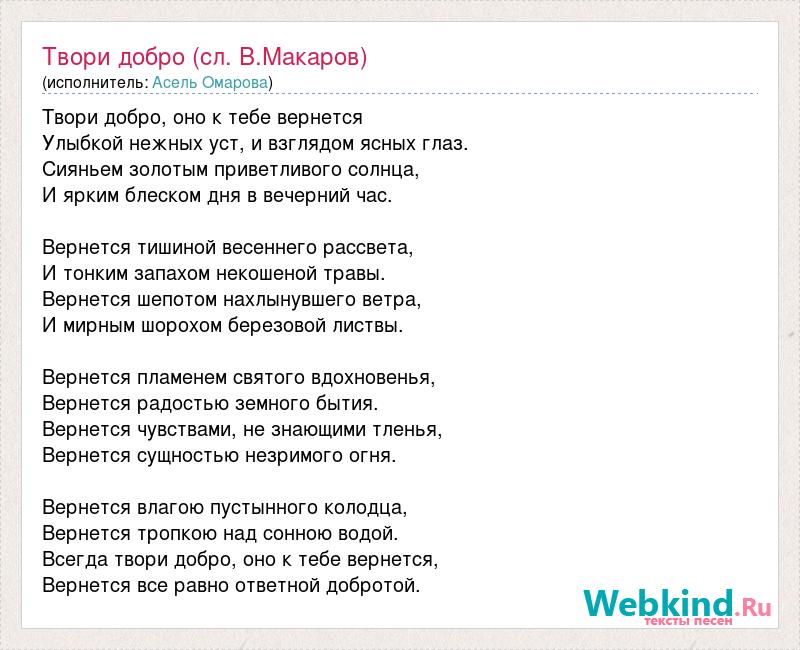 А как ты думаешь, о чем песня "Твори добро (сл. В.Макаров)" ?