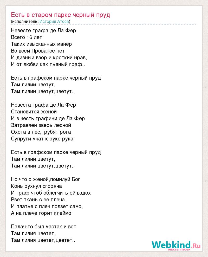 Невесте графа де Ла Фер Всего 16 лет Таких изысканных манер Во всем Провансе нет И дивный взор,и кроткий нрав, И от любви как пьяный граф.. Есть в графском парке черный пруд Там лилии цветут, Там лилии цветут,цветут.. Невеста графа де Ла Фер Становится женой И в честь графини де Ла Фер Затравлен зверь лесной Охота в лес,трубят рога Супруги мчат к руке рука Есть в графском парке черный пруд Там лилии цветут, Там лилии цветут,цветут.. Но что с женой,помилуй Бог Конь рухнул сгоряча И граф чтоб облегчить ей вздох Рвет ткань с ее плеча И платье с плеч ползет само, А на плече горит клеймо Палач-то был мастак и вот Там лилия цветет, Там лилия цветет,цветет..