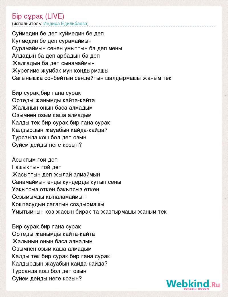 Суймедин бе деп куймедин бе деп Кулмедин бе деп сурамаймын Сурамаймын сенен умыттын ба деп мены Алдадын ба деп арбадын ба деп Жалгадын ба деп сынамаймын Журегиме жумбак мун кондырмашы Сагынышка сонбейтын сендейтын шалдырмашы жаным тек Бир сурак,бир гана сурак Ортеды жанымды кайта-кайта Жалынын онын баса алмадым Озымнен озым каша алмадым Калды тек бир сурак,бир гана сурак Калдырдын жауабын кайда-кайда? Турсанда кош бол деп озын Суйем дейды неге козын? Асыктым гой деп Гашыкпын гой деп Жасыттын деп жылай алмаймын Санамаймын енды кундерды кутып сены Уакытсыз откен,бакытсыз еткен, Сезымымды кыналамаймын Коштасудын сагатын создырмашы Умытымнын коз жасын бирак та жазгырмашы жаным тек Бир сурак,бир гана сурак Ортеды жанымды кайта-кайта Жалынын онын баса алмадым Озымнен озым каша алмадым Калды тек бир сурак,бир гана сурак Калдырдын жауабын кайда-кайда? Турсанда кош бол деп озын Суйем дейды неге козын?