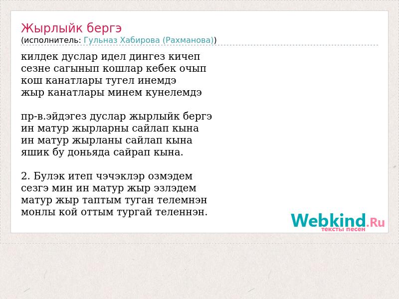 килдек дуслар идел дингез кичеп сезне сагынып кошлар кебек очып кош канатлары тугел инемдэ жыр канатлары минем кунелемдэ пр-в.эйдэгез дуслар жырлыйк бергэ ин матур жырларны сайлап кына ин матур жырланы сайлап кына яшик бу доньяда сайрап кына. 2. Булэк итеп чэчэклэр озмэдем сезгэ мин ин матур жыр эзлэдем матур жыр таптым туган телемнэн монлы кой оттым тургай теленнэн.
