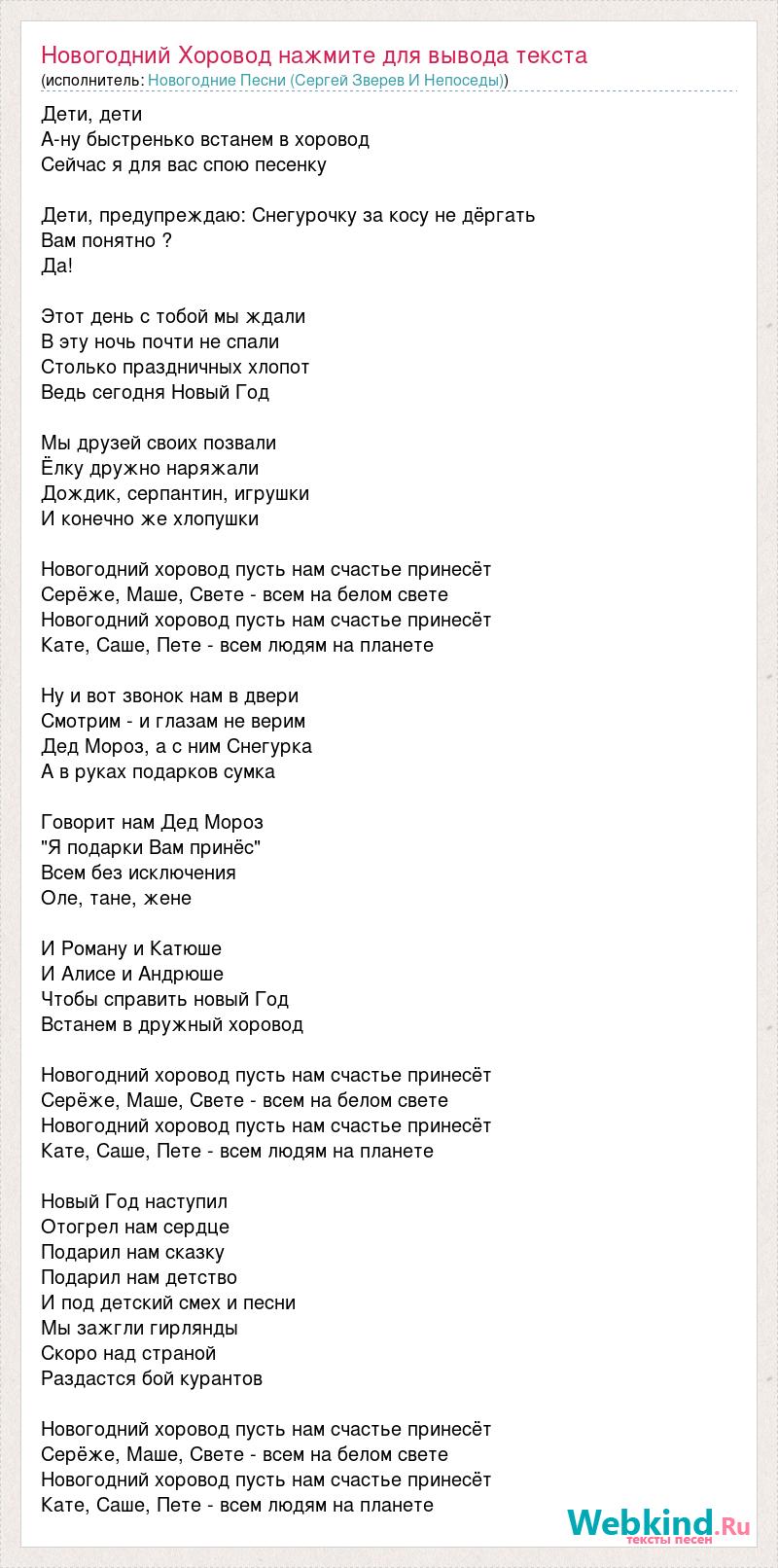Дети, дети А-ну быстренько встанем в хоровод Сейчас я для вас спою песенку Дети, предупреждаю: Снегурочку за косу не дёргать Вам понятно ? Да! Этот день с тобой мы ждали В эту ночь почти не спали Столько праздничных хлопот Ведь сегодня Новый Год Мы друзей своих позвали Ёлку дружно наряжали Дождик, серпантин, игрушки И конечно же хлопушки Новогодний хоровод пусть нам счастье принесёт Серёже, Маше, Свете - всем на белом свете Новогодний хоровод пусть нам счастье принесёт Кате, Саше, Пете - всем людям на планете Ну и вот звонок нам в двери Смотрим - и глазам не верим Дед Мороз, а с ним Снегурка А в руках подарков сумка Говорит нам Дед Мороз "Я подарки Вам принёс" Всем без исключения Оле, тане, жене И Роману и Катюше И Алисе и Андрюше Чтобы справить новый Год Встанем в дружный хоровод Новогодний хоровод пусть нам счастье принесёт Серёже, Маше, Свете - всем на белом свете Новогодний хоровод пусть нам счастье принесёт Кате, Саше, Пете - всем людям на планете Новый Год наступил Отогрел нам сердце Подарил нам сказку Подарил нам детство И под детский смех и песни Мы зажгли гирлянды Скоро над страной Раздастся бой курантов Новогодний хоровод пусть нам счастье принесёт Серёже, Маше, Свете - всем на белом свете Новогодний хоровод пусть нам счастье принесёт Кате, Саше, Пете - всем людям на планете