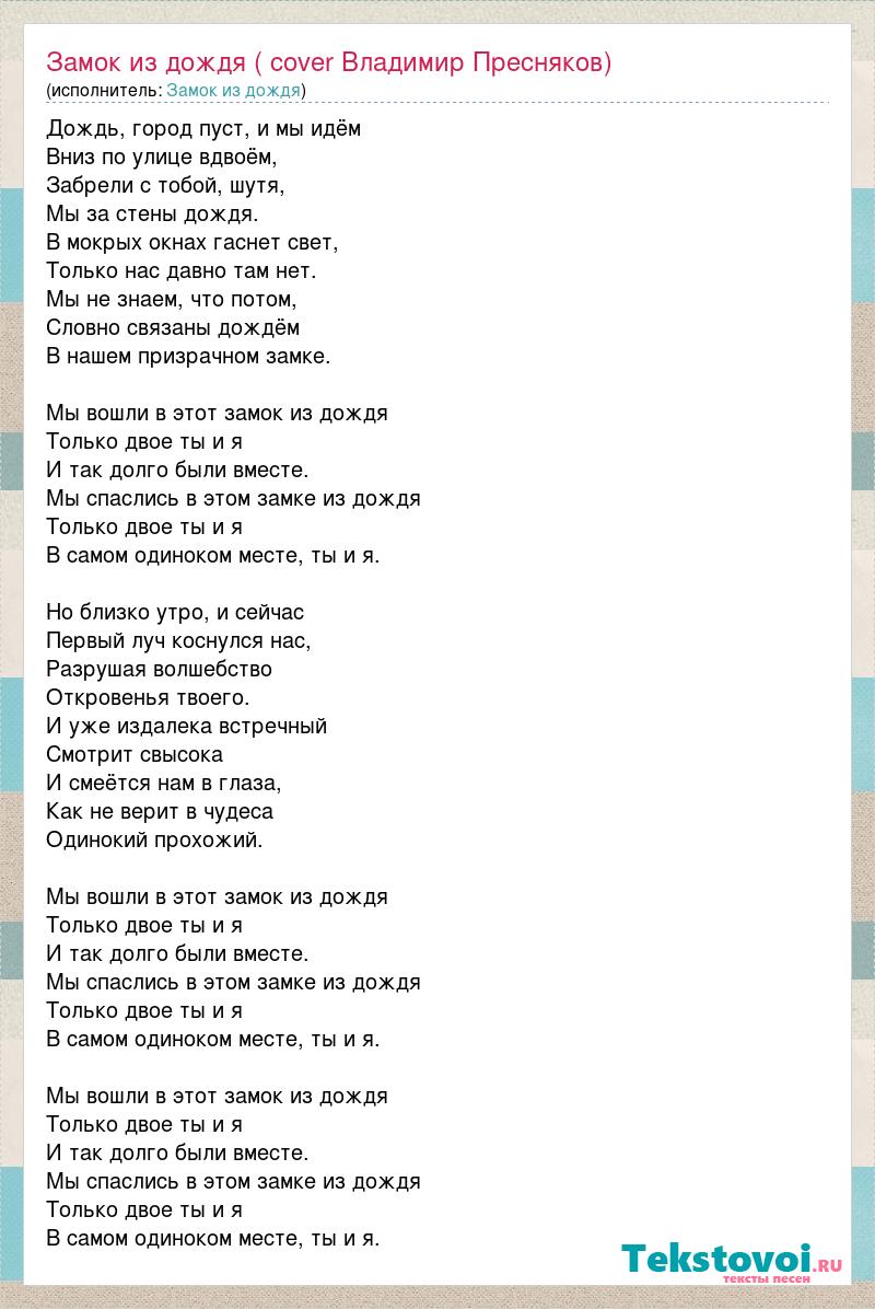 Дождь, город пуст, и мы идём Вниз по улице вдвоём, Забрели с тобой, шутя, Мы за стены дождя. В мокрых окнах гаснет свет, Только нас давно там нет. Мы не знаем, что потом, Словно связаны дождём В нашем призрачном замке. Мы вошли в этот замок из дождя Только двое ты и я И так долго были вместе. Мы спаслись в этом замке из дождя Только двое ты и я В самом одиноком месте, ты и я. Но близко утро, и сейчас Первый луч коснулся нас, Разрушая волшебство Откровенья твоего. И уже издалека встречный Смотрит свысока И смеётся нам в глаза, Как не верит в чудеса Одинокий прохожий. Мы вошли в этот замок из дождя Только двое ты и я И так долго были вместе. Мы спаслись в этом замке из дождя Только двое ты и я В самом одиноком месте, ты и я. Мы вошли в этот замок из дождя Только двое ты и я И так долго были вместе. Мы спаслись в этом замке из дождя Только двое ты и я В самом одиноком месте, ты и я.