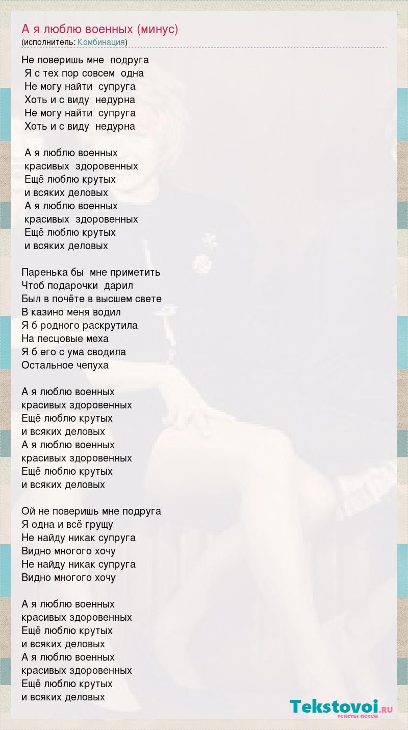 Не поверишь мне подруга Я с тех пор совсем одна Не могу найти супруга Хоть и с виду недурна Не могу найти супруга Хоть и с виду недурна А я люблю военных красивых здоровенных Ещё люблю крутых и всяких деловых А я люблю военных красивых здоровенных Ещё люблю крутых и всяких деловых Паренька бы мне приметить Чтоб подарочки дарил Был в почёте в высшем свете В казино меня водил Я б родного раскрутила На песцовые меха Я б его с ума сводила Остальное чепуха А я люблю военных красивых здоровенных Ещё люблю крутых и всяких деловых А я люблю военных красивых здоровенных Ещё люблю крутых и всяких деловых Ой не поверишь мне подруга Я одна и всё грущу Не найду никак супруга Видно многого хочу Не найду никак супруга Видно многого хочу А я люблю военных красивых здоровенных Ещё люблю крутых и всяких деловых А я люблю военных красивых здоровенных Ещё люблю крутых и всяких деловых