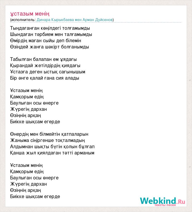 Тыңдағанған көңілдегі толғамымды Шындаған тәрбием мен талғамымды Өмірдің маған сыйы деп білемін Өзіңдей жанға шәкірт болғанымды Табылған балапан ем ұядағы Қырандай жетілдірдің қиядағы Ұстазға деген ыстық сағынышым Бір әнге қалай ғана сия алады Ұстазым менің Қамқорым едің Баулыған осы өнерге Жүрегің дархан Өзіңнің арқаң Биікке шықсам егерде Өнердің мен білмейтін қатпаларын Жаныма сіңіргенше тоқталмадың Алдымнан шықты бүгін қолын бұлғап Қанша жыл қиялдаған тәтті арманым Ұстазым менің Қамқорым едің Баулыған осы өнерге Жүрегің дархан Өзіңнің арқаң Биікке шықсам егерде