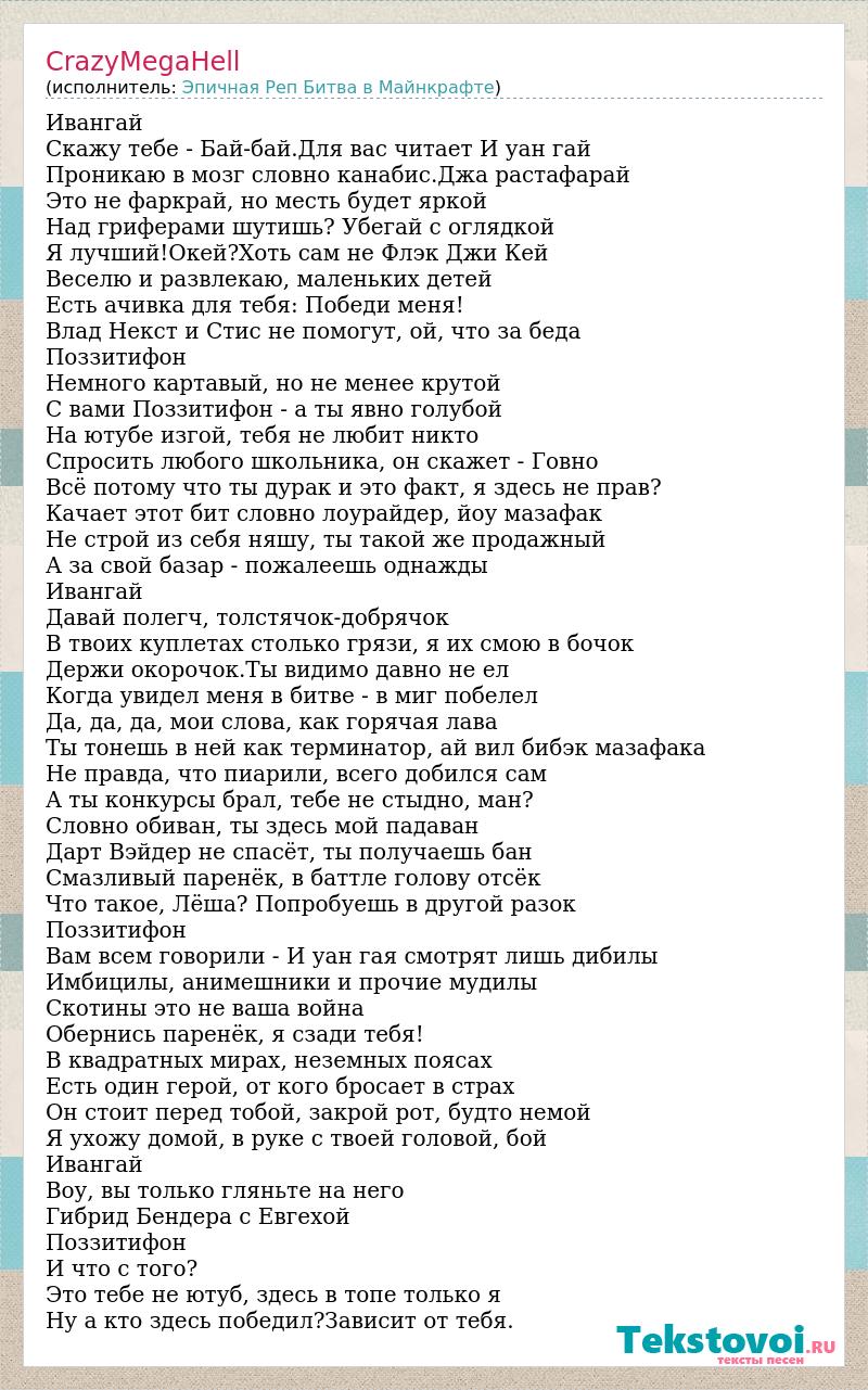 Ивангай Скажу тебе - Бай-бай.Для вас читает И уан гай Проникаю в мозг словно канабис.Джа растафарай Это не фаркрай, но месть будет яркой Над гриферами шутишь? Убегай с оглядкой Я лучший!Окей?Хоть сам не Флэк Джи Кей Веселю и развлекаю, маленьких детей Есть ачивка для тебя: Победи меня! Влад Некст и Стис не помогут, ой, что за беда Поззитифон Немного картавый, но не менее крутой С вами Поззитифон - а ты явно голубой На ютубе изгой, тебя не любит никто Спросить любого школьника, он скажет - Говно Всё потому что ты дурак и это факт, я здесь не прав? Качает этот бит словно лоурайдер, йоу мазафак Не строй из себя няшу, ты такой же продажный А за свой базар - пожалеешь однажды Ивангай Давай полегч, толстячок-добрячок В твоих куплетах столько грязи, я их смою в бочок Держи окорочок.Ты видимо давно не ел Когда увидел меня в битве - в миг побелел Да, да, да, мои слова, как горячая лава Ты тонешь в ней как терминатор, ай вил бибэк мазафака Не правда, что пиарили, всего добился сам А ты конкурсы брал, тебе не стыдно, ман? Словно обиван, ты здесь мой падаван Дарт Вэйдер не спасёт, ты получаешь бан Смазливый паренёк, в баттле голову отсёк Что такое, Лёша? Попробуешь в другой разок Поззитифон Вам всем говорили - И уан гая смотрят лишь дибилы Имбицилы, анимешники и прочие мудилы Скотины это не ваша война Обернись паренёк, я сзади тебя! В квадратных мирах, неземных поясах Есть один герой, от кого бросает в страх Он стоит перед тобой, закрой рот, будто немой Я ухожу домой, в руке с твоей головой, бой Ивангай Воу, вы только гляньте на него Гибрид Бендера с Евгехой Поззитифон И что с того? Это тебе не ютуб, здесь в топе только я Ну а кто здесь победил?Зависит от тебя.