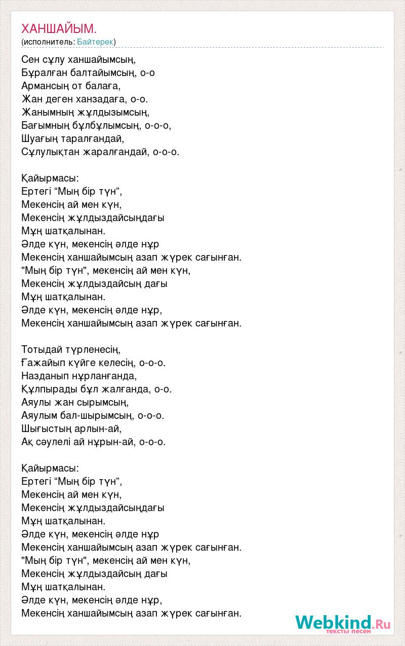 Сен сұлу ханшайымсың, Бұралған балтайымсың, о-о Армансың от балаға, Жан деген ханзадаға, о-о. Жанымның жұлдызымсың, Бағымның бұлбұлымсың, о-о-о, Шуағың таралғандай, Сұлулықтан жаралғандай, о-о-о. Қайырмасы: Ертегi “Мың бiр түн”, Мекенсiң ай мен күн, Мекенсiң жұлдыздайсыңдағы Мұң шатқалынан. Әлде күн, мекенсiң әлде нұр Мекенсiң ханшайымсың азап жүрек сағынған. "Мың бiр түн", мекенсiң ай мен күн, Мекенсiң жұлдыздайсың дағы Мұң шатқалынан. Әлде күн, мекенсiң әлде нұр, Мекенсiң ханшайымсың азап жүрек сағынған. Тотыдай түрленесiң, Ғажайып күйге келесiң, о-о-о. Назданып нұрланғанда, Құлпырады бұл жалғанда, о-о. Аяулы жан сырымсың, Аяулым бал-шырымсың, о-о-о. Шығыстың арлын-ай, Ақ сәулелi ай нұрын-ай, о-о-о. Қайырмасы: Ертегi “Мың бiр түн”, Мекенсiң ай мен күн, Мекенсiң жұлдыздайсыңдағы Мұң шатқалынан. Әлде күн, мекенсiң әлде нұр Мекенсiң ханшайымсың азап жүрек сағынған. "Мың бiр түн", мекенсiң ай мен күн, Мекенсiң жұлдыздайсың дағы Мұң шатқалынан. Әлде күн, мекенсiң әлде нұр, Мекенсiң ханшайымсың азап жүрек сағынған.