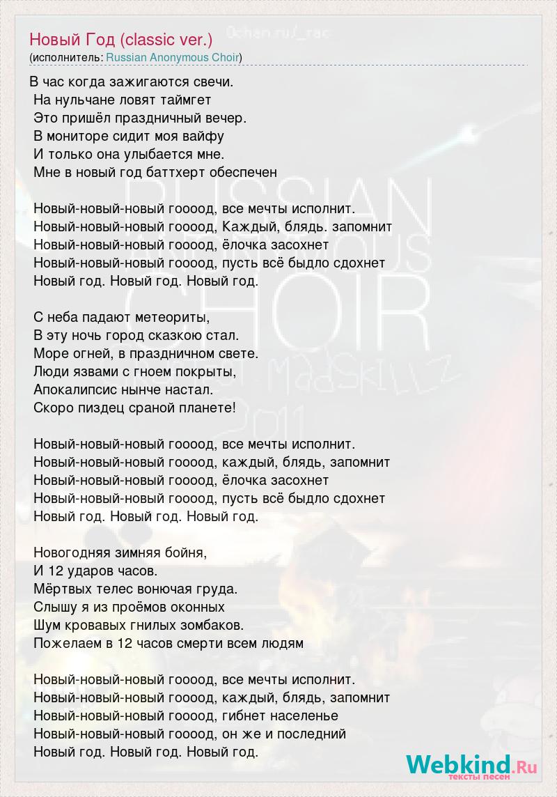 В час когда зажигаются свечи. На нульчане ловят таймгет Это пришёл праздничный вечер. В мониторе сидит моя вайфу И только она улыбается мне. Мне в новый год баттхерт обеспечен Новый-новый-новый гоооод, все мечты исполнит. Новый-новый-новый гоооод, Каждый, блядь. запомнит Новый-новый-новый гоооод, ёлочка засохнет Новый-новый-новый гоооод, пусть всё быдло сдохнет Новый год. Новый год. Новый год. С неба падают метеориты, В эту ночь город сказкою стал. Море огней, в праздничном свете. Люди язвами с гноем покрыты, Апокалипсис нынче настал. Скоро пиздец сраной планете! Новый-новый-новый гоооод, все мечты исполнит. Новый-новый-новый гоооод, каждый, блядь, запомнит Новый-новый-новый гоооод, ёлочка засохнет Новый-новый-новый гоооод, пусть всё быдло сдохнет Новый год. Новый год. Новый год. Новогодняя зимняя бойня, И 12 ударов часов. Мёртвых телес вонючая груда. Слышу я из проёмов оконных Шум кровавых гнилых зомбаков. Пожелаем в 12 часов смерти всем людям Новый-новый-новый гоооод, все мечты исполнит. Новый-новый-новый гоооод, каждый, блядь, запомнит Новый-новый-новый гоооод, гибнет населенье Новый-новый-новый гоооод, он же и последний Новый год. Новый год. Новый год.