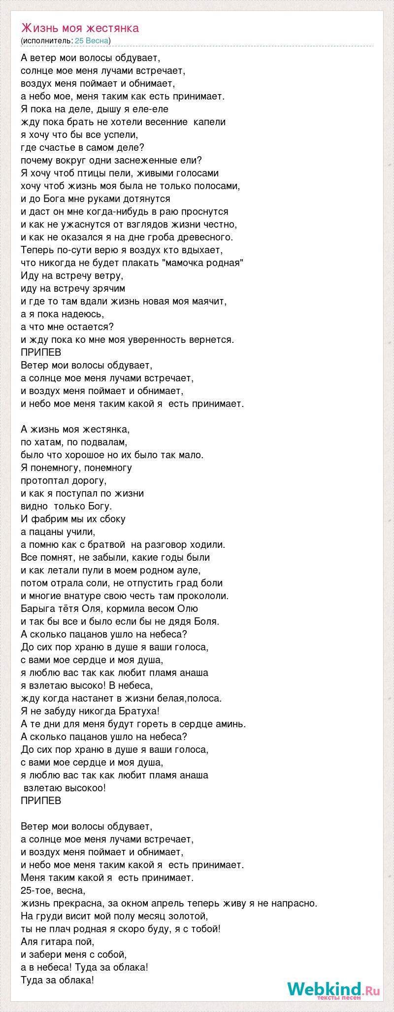 А ветер мои волосы обдувает, солнце мое меня лучами встречает, воздух меня поймает и обнимает, а небо мое, меня таким как есть принимает. Я пока на деле, дышу я еле-еле жду пока брать не хотели весенние капели я хочу что бы все успели, где счастье в самом деле? почему вокруг одни заснеженные ели? Я хочу чтоб птицы пели, живыми голосами хочу чтоб жизнь моя была не только полосами, и до Бога мне руками дотянутся и даст он мне когда-нибудь в раю проснутся и как не ужаснутся от взглядов жизни честно, и как не оказался я на дне гроба древесного. Теперь по-сути верю я воздух кто вдыхает, что никогда не будет плакать "мамочка родная" Иду на встречу ветру, иду на встречу зрячим и где то там вдали жизнь новая моя маячит, а я пока надеюсь, а что мне остается? и жду пока ко мне моя уверенность вернется. ПРИПЕВ Ветер мои волосы обдувает, а солнце мое меня лучами встречает, и воздух меня поймает и обнимает, и небо мое меня таким какой я есть принимает. А жизнь моя жестянка, по хатам, по подвалам, было что хорошое но их было так мало. Я понемногу, понемногу протоптал дорогу, и как я поступал по жизни видно только Богу. И фабрим мы их сбоку а пацаны учили, а помню как с братвой на разговор ходили. Все помнят, не забыли, какие годы были и как летали пули в моем родном ауле, потом отрала соли, не отпустить град боли и многие внатуре свою честь там прокололи. Барыга тётя Оля, кормила весом Олю и так бы все и было если бы не дядя Боля. А сколько пацанов ушло на небеса? До сих пор храню в душе я ваши голоса, с вами мое сердце и моя душа, я люблю вас так как любит пламя анаша я взлетаю высоко! В небеса, жду когда настанет в жизни белая,полоса. Я не забуду никогда Братуха! А те дни для меня будут гореть в сердце аминь. А сколько пацанов ушло на небеса? До сих пор храню в душе я ваши голоса, с вами мое сердце и моя душа, я люблю вас так как любит пламя анаша взлетаю высокоо! ПРИПЕВ Ветер мои волосы обдувает, а солнце мое меня лучами встречает, и воздух меня поймает и обнимает, и небо мое меня таким какой я есть принимает. Меня таким какой я есть принимает. 25-тое, весна, жизнь прекрасна, за окном апрель теперь живу я не напрасно. На груди висит мой полу месяц золотой, ты не плач родная я скоро буду, я с тобой! Аля гитара пой, и забери меня с собой, а в небеса! Туда за облака! Туда за облака!