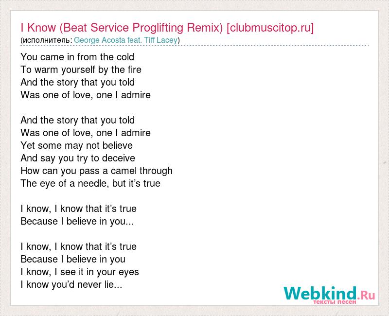 А как ты думаешь, о чем песня "I Know (Beat Service Proglifting Remix) [clubmuscitop.ru]" ?
