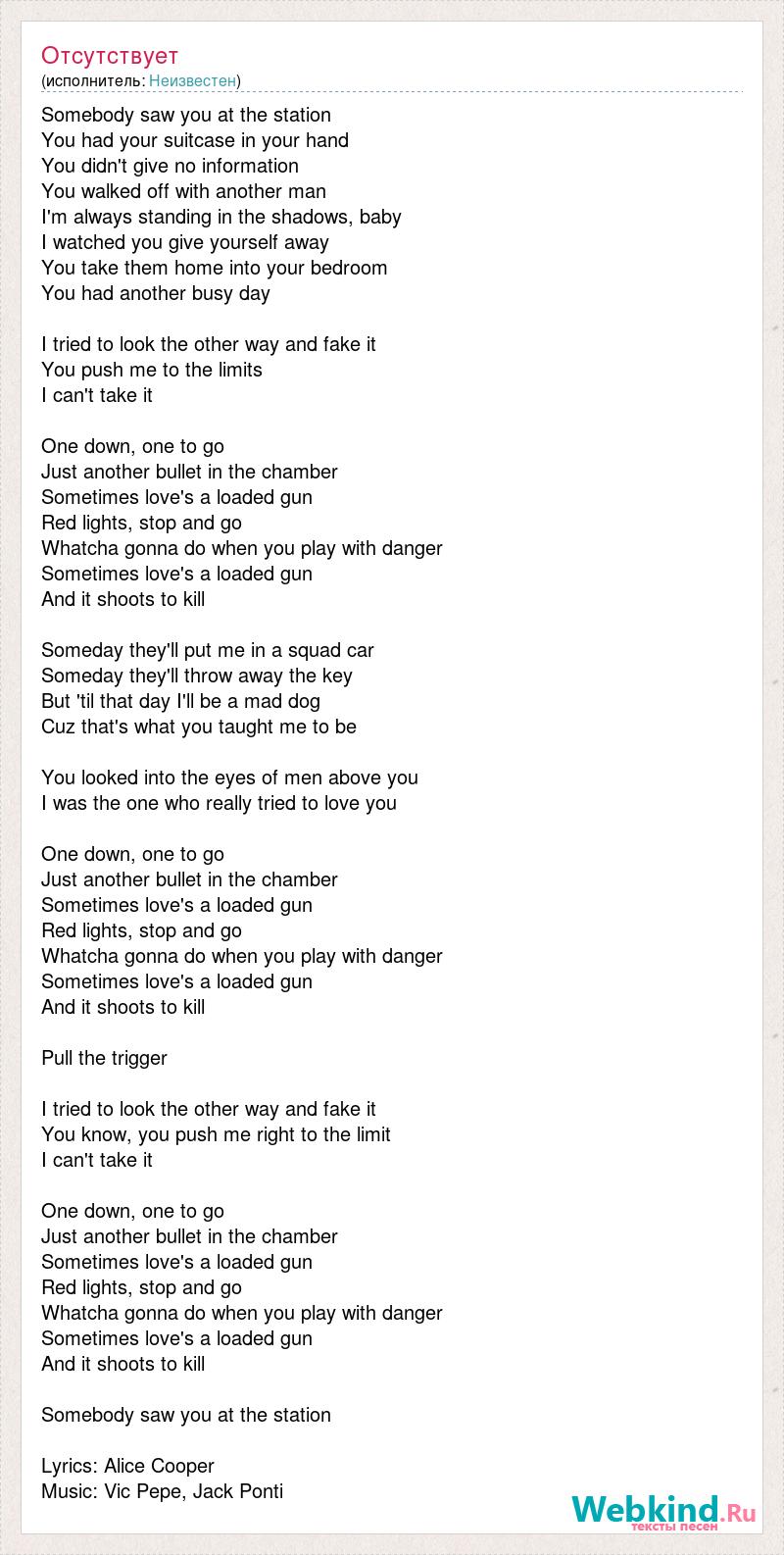 Somebody saw you at the station You had your suitcase in your hand You didn't give no information You walked off with another man I'm always standing in the shadows, baby I watched you give yourself away You take them home into your bedroom You had another busy day I tried to look the other way and fake it You push me to the limits I can't take it One down, one to go Just another bullet in the chamber Sometimes love's a loaded gun Red lights, stop and go Whatcha gonna do when you play with danger Sometimes love's a loaded gun And it shoots to kill Someday they'll put me in a squad car Someday they'll throw away the key But 'til that day I'll be a mad dog Cuz that's what you taught me to be You looked into the eyes of men above you I was the one who really tried to love you One down, one to go Just another bullet in the chamber Sometimes love's a loaded gun Red lights, stop and go Whatcha gonna do when you play with danger Sometimes love's a loaded gun And it shoots to kill Pull the trigger I tried to look the other way and fake it You know, you push me right to the limit I can't take it One down, one to go Just another bullet in the chamber Sometimes love's a loaded gun Red lights, stop and go Whatcha gonna do when you play with danger Sometimes love's a loaded gun And it shoots to kill Somebody saw you at the station Lyrics: Alice Cooper Music: Vic Pepe, Jack Ponti