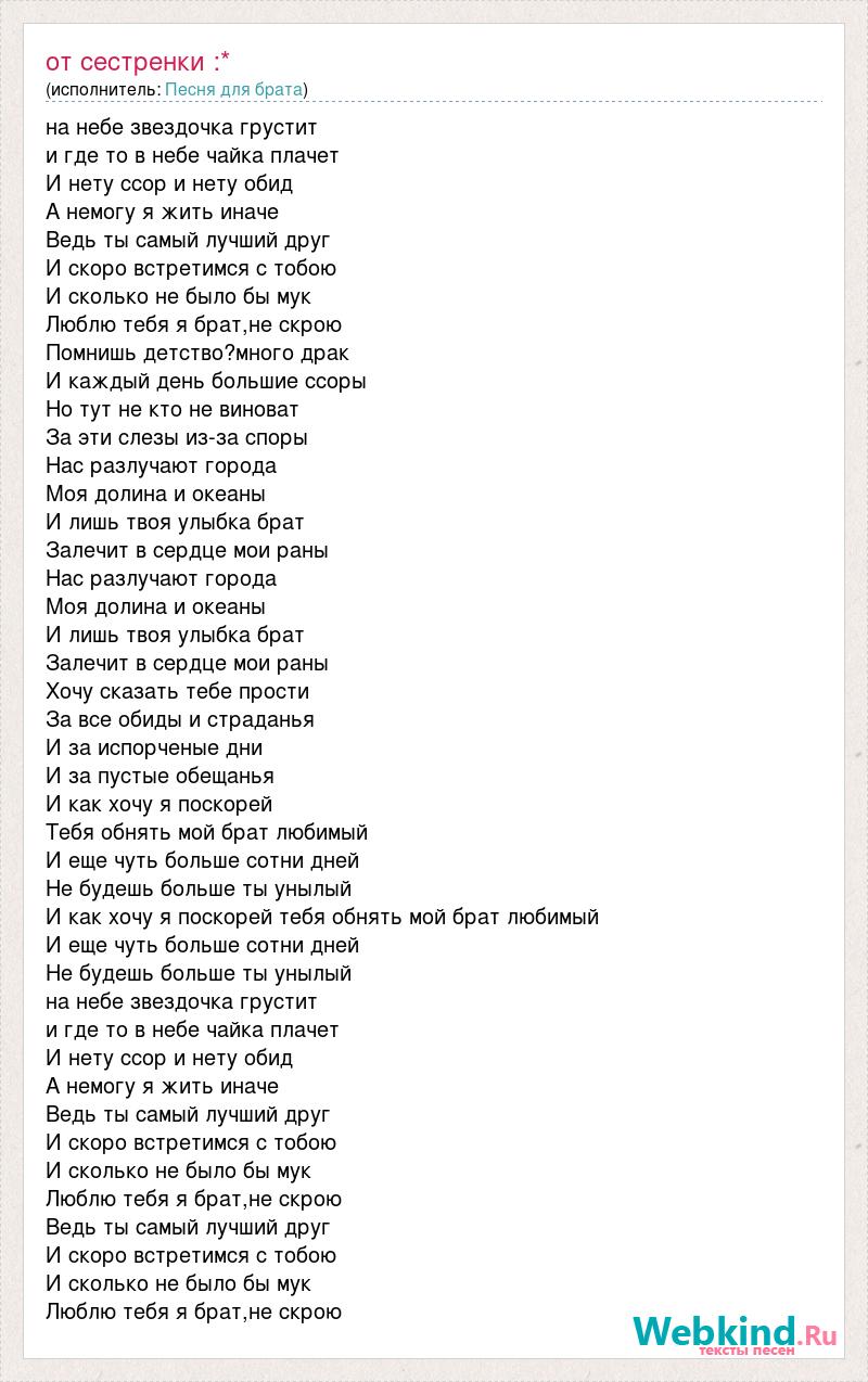 на небе звездочка грустит и где то в небе чайка плачет И нету ссор и нету обид А немогу я жить иначе Ведь ты самый лучший друг И скоро встретимся с тобою И сколько не было бы мук Люблю тебя я брат,не скрою Помнишь детство?много драк И каждый день большие ссоры Но тут не кто не виноват За эти слезы из-за споры Нас разлучают города Моя долина и океаны И лишь твоя улыбка брат Залечит в сердце мои раны Нас разлучают города Моя долина и океаны И лишь твоя улыбка брат Залечит в сердце мои раны Хочу сказать тебе прости За все обиды и страданья И за испорченые дни И за пустые обещанья И как хочу я поскорей Тебя обнять мой брат любимый И еще чуть больше сотни дней Не будешь больше ты унылый И как хочу я поскорей тебя обнять мой брат любимый И еще чуть больше сотни дней Не будешь больше ты унылый на небе звездочка грустит и где то в небе чайка плачет И нету ссор и нету обид А немогу я жить иначе Ведь ты самый лучший друг И скоро встретимся с тобою И сколько не было бы мук Люблю тебя я брат,не скрою Ведь ты самый лучший друг И скоро встретимся с тобою И сколько не было бы мук Люблю тебя я брат,не скрою