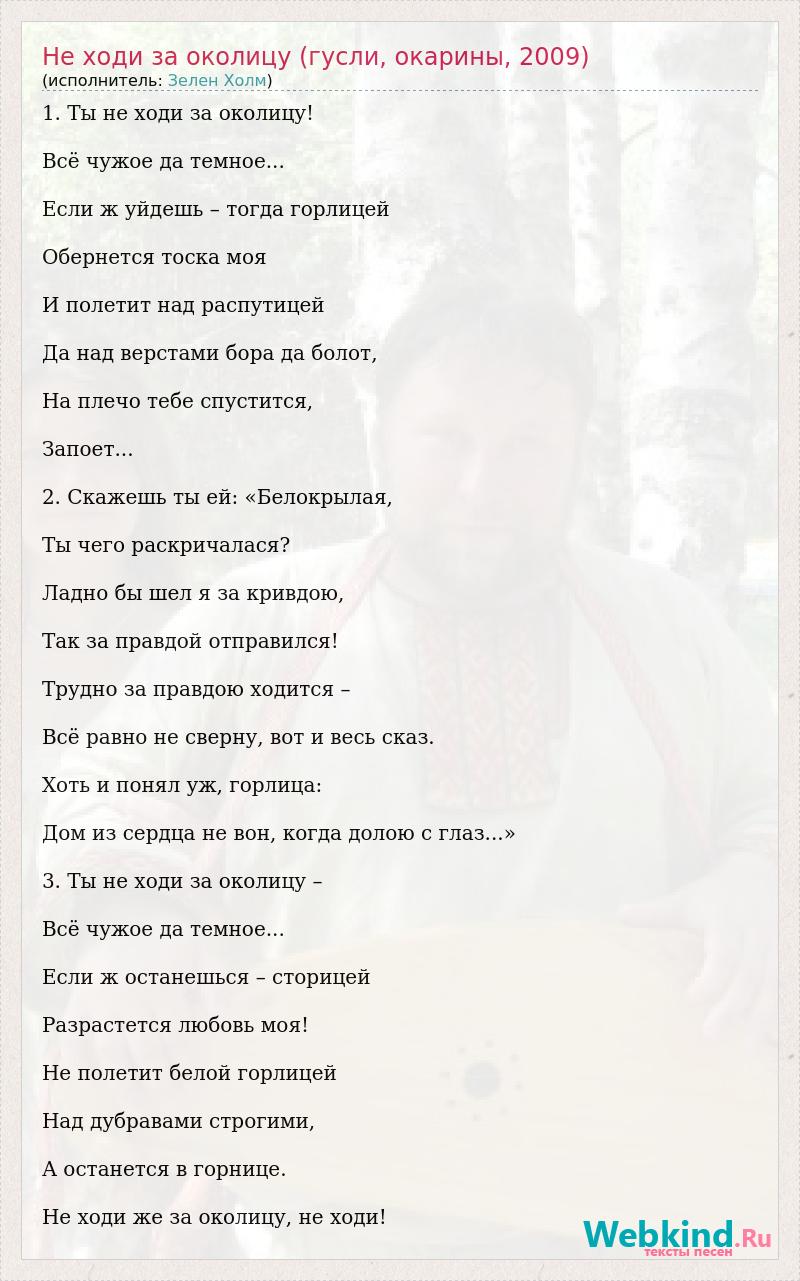 1. Ты не ходи за околицу! Всё чужое да темное... Если ж уйдешь – тогда горлицей Обернется тоска моя И полетит над распутицей Да над верстами бора да болот, На плечо тебе спустится, Запоет... 2. Скажешь ты ей: «Белокрылая, Ты чего раскричалася? Ладно бы шел я за кривдою, Так за правдой отправился! Трудно за правдою ходится – Всё равно не сверну, вот и весь сказ. Хоть и понял уж, горлица: Дом из сердца не вон, когда долою с глаз...» 3. Ты не ходи за околицу – Всё чужое да темное... Если ж останешься – сторицей Разрастется любовь моя! Не полетит белой горлицей Над дубравами строгими, А останется в горнице. Не ходи же за околицу, не ходи!