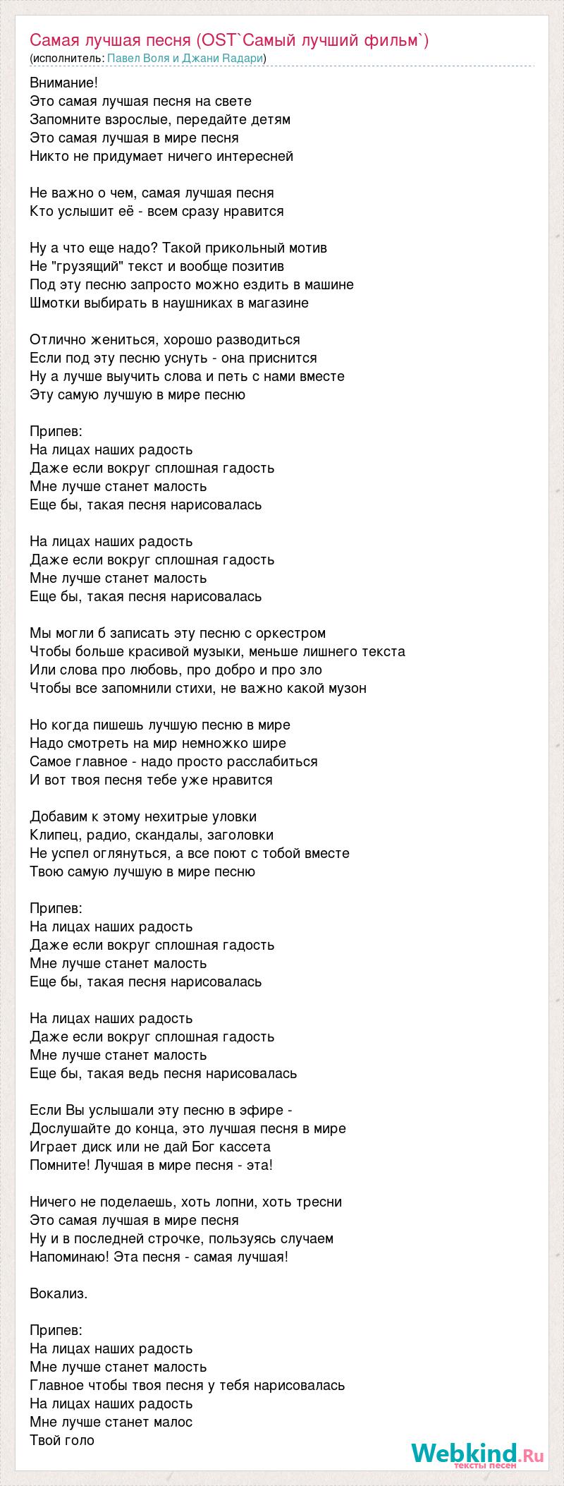 Внимание! Это самая лучшая песня на свете Запомните взрослые, передайте детям Это самая лучшая в мире песня Никто не придумает ничего интересней Не важно о чем, самая лучшая песня Кто услышит её - всем сразу нравится Ну а что еще надо? Такой прикольный мотив Не "грузящий" текст и вообще позитив Под эту песню запросто можно ездить в машине Шмотки выбирать в наушниках в магазине Отлично жениться, хорошо разводиться Если под эту песню уснуть - она приснится Ну а лучше выучить слова и петь с нами вместе Эту самую лучшую в мире песню Припев: На лицах наших радость Даже если вокруг сплошная гадость Мне лучше станет малость Еще бы, такая песня нарисовалась На лицах наших радость Даже если вокруг сплошная гадость Мне лучше станет малость Еще бы, такая песня нарисовалась Мы могли б записать эту песню с оркестром Чтобы больше красивой музыки, меньше лишнего текста Или слова про любовь, про добро и про зло Чтобы все запомнили стихи, не важно какой музон Но когда пишешь лучшую песню в мире Надо смотреть на мир немножко шире Самое главное - надо просто расслабиться И вот твоя песня тебе уже нравится Добавим к этому нехитрые уловки Клипец, радио, скандалы, заголовки Не успел оглянуться, а все поют с тобой вместе Твою самую лучшую в мире песню Припев: На лицах наших радость Даже если вокруг сплошная гадость Мне лучше станет малость Еще бы, такая песня нарисовалась На лицах наших радость Даже если вокруг сплошная гадость Мне лучше станет малость Еще бы, такая ведь песня нарисовалась Если Вы услышали эту песню в эфире - Дослушайте до конца, это лучшая песня в мире Играет диск или не дай Бог кассета Помните! Лучшая в мире песня - эта! Ничего не поделаешь, хоть лопни, хоть тресни Это самая лучшая в мире песня Ну и в последней строчке, пользуясь случаем Напоминаю! Эта песня - самая лучшая! Вокализ. Припев: На лицах наших радость Мне лучше станет малость Главное чтобы твоя песня у тебя нарисовалась На лицах наших радость Мне лучше станет малос Твой голо