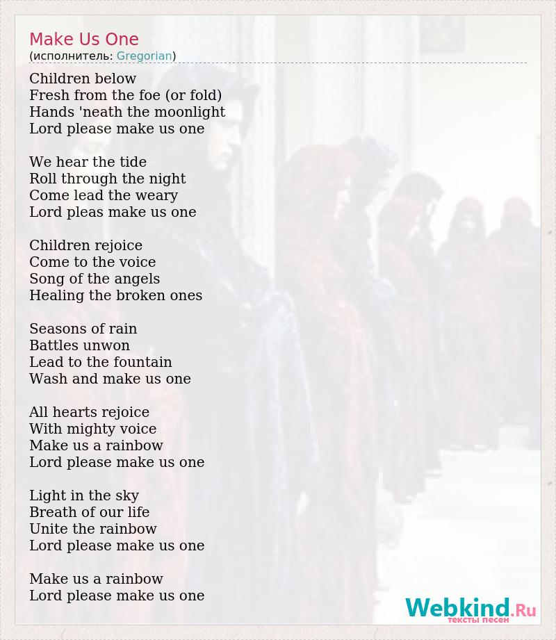 Children below Fresh from the foe (or fold) Hands 'neath the moonlight Lord please make us one We hear the tide Roll through the night Come lead the weary Lord pleas make us one Children rejoice Come to the voice Song of the angels Healing the broken ones Seasons of rain Battles unwon Lead to the fountain Wash and make us one All hearts rejoice With mighty voice Make us a rainbow Lord please make us one Light in the sky Breath of our life Unite the rainbow Lord please make us one Make us a rainbow Lord please make us one
