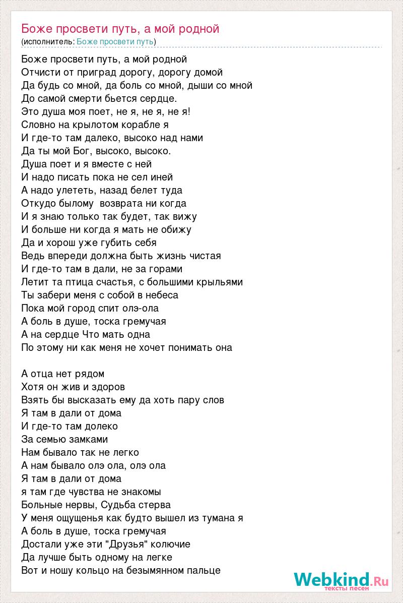 Боже просвети путь, а мой родной Отчисти от приград дорогу, дорогу домой Да будь со мной, да боль со мной, дыши со мной До самой смерти бьется сердце. Это душа моя поет, не я, не я, не я! Словно на крылотом корабле я И где-то там далеко, высоко над нами Да ты мой Бог, высоко, высоко. Душа поет и я вместе с ней И надо писать пока не сел иней А надо улететь, назад белет туда Откудо былому возврата ни когда И я знаю только так будет, так вижу И больше ни когда я мать не обижу Да и хорош уже губить себя Ведь впереди должна быть жизнь чистая И где-то там в дали, не за горами Летит та птица счастья, с большими крыльями Ты забери меня с собой в небеса Пока мой город спит олэ-ола А боль в душе, тоска гремучая А на сердце Что мать одна По этому ни как меня не хочет понимать она А отца нет рядом Хотя он жив и здоров Взять бы высказать ему да хоть пару слов Я там в дали от дома И где-то там долеко За семью замками Нам бывало так не легко А нам бывало олэ ола, олэ ола Я там в дали от дома я там где чувства не знакомы Больные нервы, Судьба стерва У меня ощущенья как будто вышел из тумана я А боль в душе, тоска гремучая Достали уже эти "Друзья" колючие Да лучше быть одному на легке Вот и ношу кольцо на безымянном пальце
