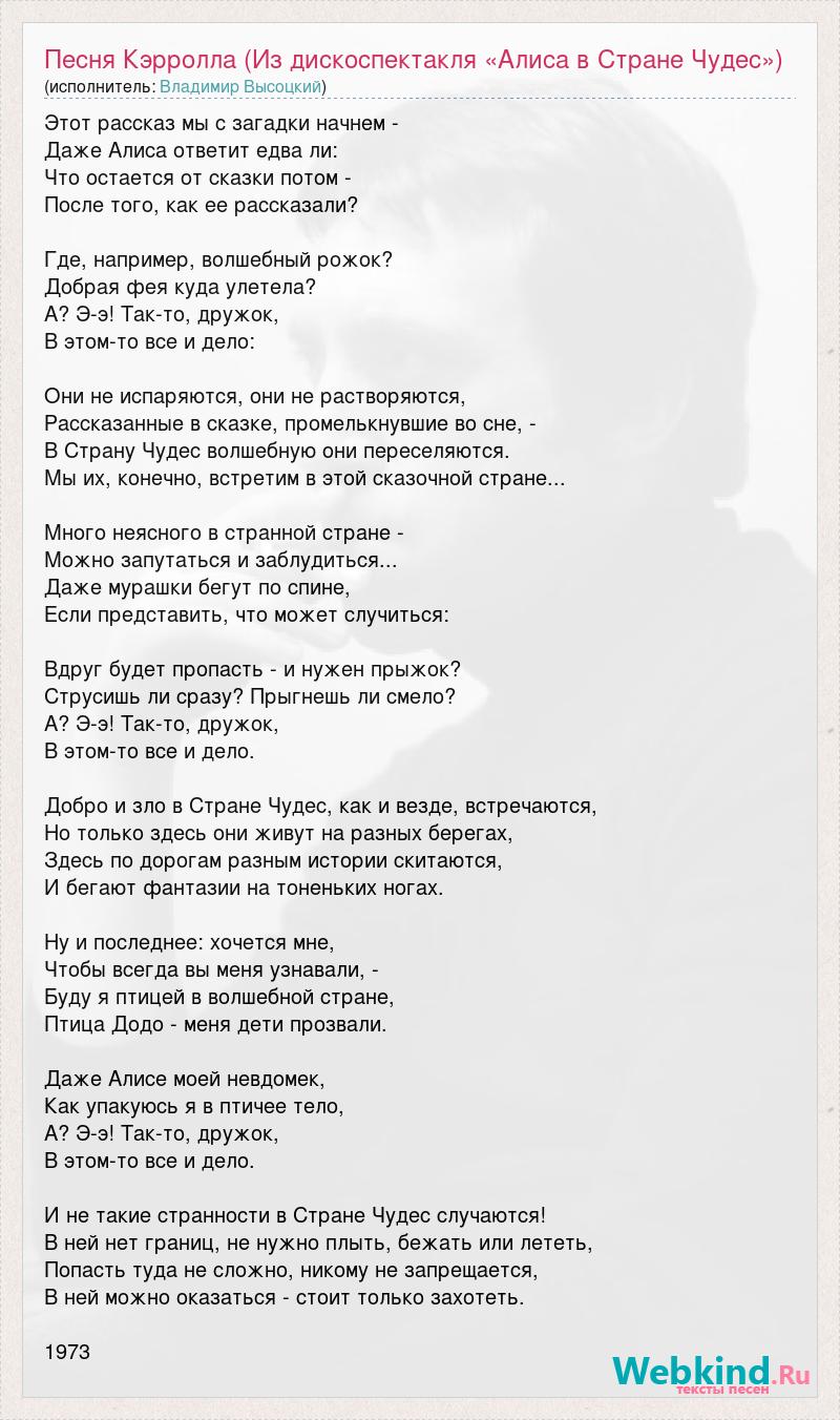 Этот рассказ мы с загадки начнем - Даже Алиса ответит едва ли: Что остается от сказки потом - После того, как ее рассказали? Где, например, волшебный рожок? Добрая фея куда улетела? А? Э-э! Так-то, дружок, В этом-то все и дело: Они не испаряются, они не растворяются, Рассказанные в сказке, промелькнувшие во сне, - В Страну Чудес волшебную они переселяются. Мы их, конечно, встретим в этой сказочной стране... Много неясного в странной стране - Можно запутаться и заблудиться... Даже мурашки бегут по спине, Если представить, что может случиться: Вдруг будет пропасть - и нужен прыжок? Струсишь ли сразу? Прыгнешь ли смело? А? Э-э! Так-то, дружок, В этом-то все и дело. Добро и зло в Стране Чудес, как и везде, встречаются, Но только здесь они живут на разных берегах, Здесь по дорогам разным истории скитаются, И бегают фантазии на тоненьких ногах. Ну и последнее: хочется мне, Чтобы всегда вы меня узнавали, - Буду я птицей в волшебной стране, Птица Додо - меня дети прозвали. Даже Алисе моей невдомек, Как упакуюсь я в птичее тело, А? Э-э! Так-то, дружок, В этом-то все и дело. И не такие странности в Стране Чудес случаются! В ней нет границ, не нужно плыть, бежать или лететь, Попасть туда не сложно, никому не запрещается, В ней можно оказаться - стоит только захотеть. 1973