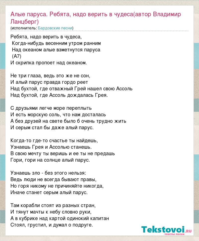Ребята, надо верить в чудеса, Когда-нибудь весенним утром ранним Над океаном алые взметнутся паруса (A7) И скрипка пропоет над океаном. Не три глаза, ведь это же не сон, И алый парус правда гордо реет Над бухтой, где отважный Грей нашел свою Ассоль Над бухтой, где Ассоль дождалась Грея. С друзьями легче море переплыть И есть морскую соль, что нам досталась А без друзей на свете было б очень трудно жить И серым стал бы даже алый парус. Когда-то где-то счастье ты найдешь, Узнаешь Грея и Ассолью станешь. В свою мечту ты веришь и ее ты не предашь Гори, гори на солнце алый парус. Узнаешь зло - без этого нельзя: Ведь люди не всегда бывают правы, Но горя никому не причиняйте никогда, Иначе станет серым алый парус. Там корабли стоят из разных стран, И тянут мачты к небу словно руки, А в кубрике над картой одинокий капитан Стоял, грустил, и думал о подруге.
