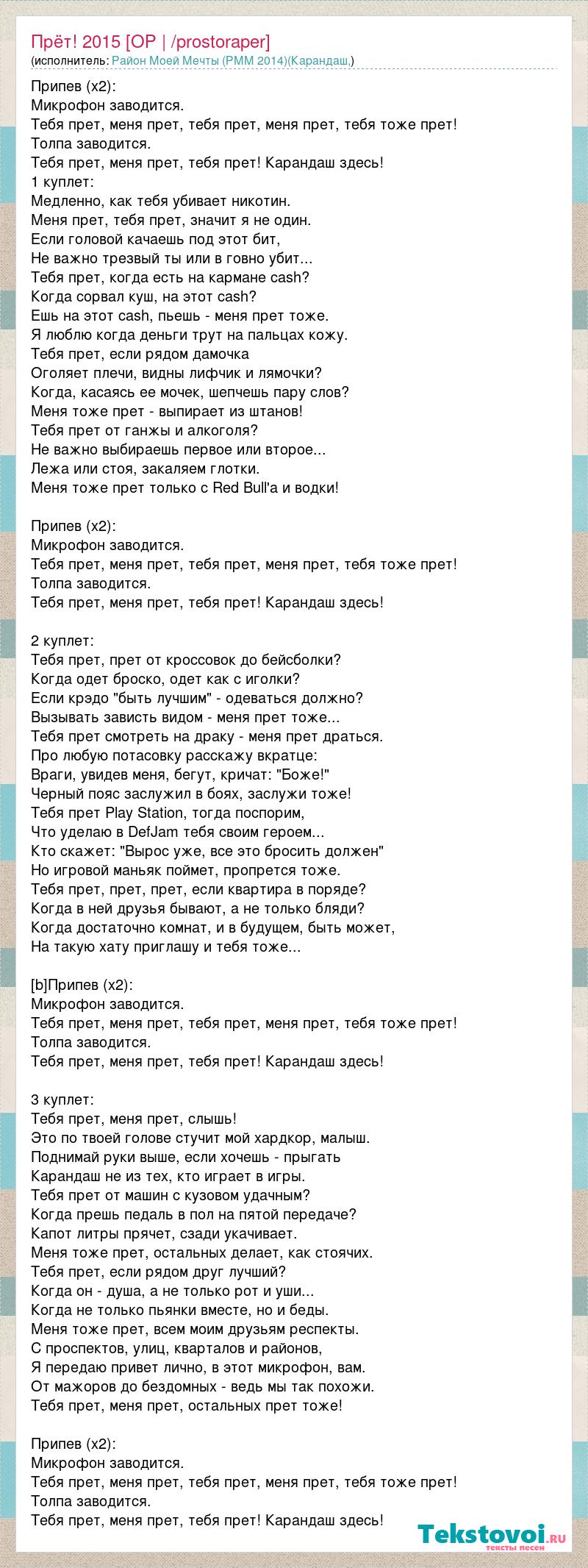 Припев (х2): Микрофон заводится. Тебя прет, меня прет, тебя прет, меня прет, тебя тоже прет! Толпа заводится. Тебя прет, меня прет, тебя прет! Карандаш здесь! 1 куплет: Медленно, как тебя убивает никотин. Меня прет, тебя прет, значит я не один. Если головой качаешь под этот бит, Не важно трезвый ты или в говно убит... Тебя прет, когда есть на кармане cash? Когда сорвал куш, на этот cash? Ешь на этот cash, пьешь - меня прет тоже. Я люблю когда деньги трут на пальцах кожу. Тебя прет, если рядом дамочка Оголяет плечи, видны лифчик и лямочки? Когда, касаясь ее мочек, шепчешь пару слов? Меня тоже прет - выпирает из штанов! Тебя прет от ганжы и алкоголя? Не важно выбираешь первое или второе... Лежа или стоя, закаляем глотки. Меня тоже прет только с Red Bull'а и водки! Припев (х2): Микрофон заводится. Тебя прет, меня прет, тебя прет, меня прет, тебя тоже прет! Толпа заводится. Тебя прет, меня прет, тебя прет! Карандаш здесь! 2 куплет: Тебя прет, прет от кроссовок до бейсболки? Когда одет броско, одет как с иголки? Если крэдо "быть лучшим" - одеваться должно? Вызывать зависть видом - меня прет тоже... Тебя прет смотреть на драку - меня прет драться. Про любую потасовку расскажу вкратце: Враги, увидев меня, бегут, кричат: "Боже!" Черный пояс заслужил в боях, заслужи тоже! Тебя прет Play Station, тогда поспорим, Что уделаю в DefJam тебя своим героем... Кто скажет: "Вырос уже, все это бросить должен" Но игровой маньяк поймет, пропрется тоже. Тебя прет, прет, прет, если квартира в поряде? Когда в ней друзья бывают, а не только бляди? Когда достаточно комнат, и в будущем, быть может, На такую хату приглашу и тебя тоже... [b]Припев (х2): Микрофон заводится. Тебя прет, меня прет, тебя прет, меня прет, тебя тоже прет! Толпа заводится. Тебя прет, меня прет, тебя прет! Карандаш здесь! 3 куплет: Тебя прет, меня прет, слышь! Это по твоей голове стучит мой хардкор, малыш. Поднимай руки выше, если хочешь - прыгать Карандаш не из тех, кто играет в игры. Тебя прет от машин с кузовом удачным? Когда прешь педаль в пол на пятой передаче? Капот литры прячет, сзади укачивает. Меня тоже прет, остальных делает, как стоячих. Тебя прет, если рядом друг лучший? Когда он - душа, а не только рот и уши... Когда не только пьянки вместе, но и беды. Меня тоже прет, всем моим друзьям респекты. С проспектов, улиц, кварталов и районов, Я передаю привет лично, в этот микрофон, вам. От мажоров до бездомных - ведь мы так похожи. Тебя прет, меня прет, остальных прет тоже! Припев (х2): Микрофон заводится. Тебя прет, меня прет, тебя прет, меня прет, тебя тоже прет! Толпа заводится. Тебя прет, меня прет, тебя прет! Карандаш здесь!