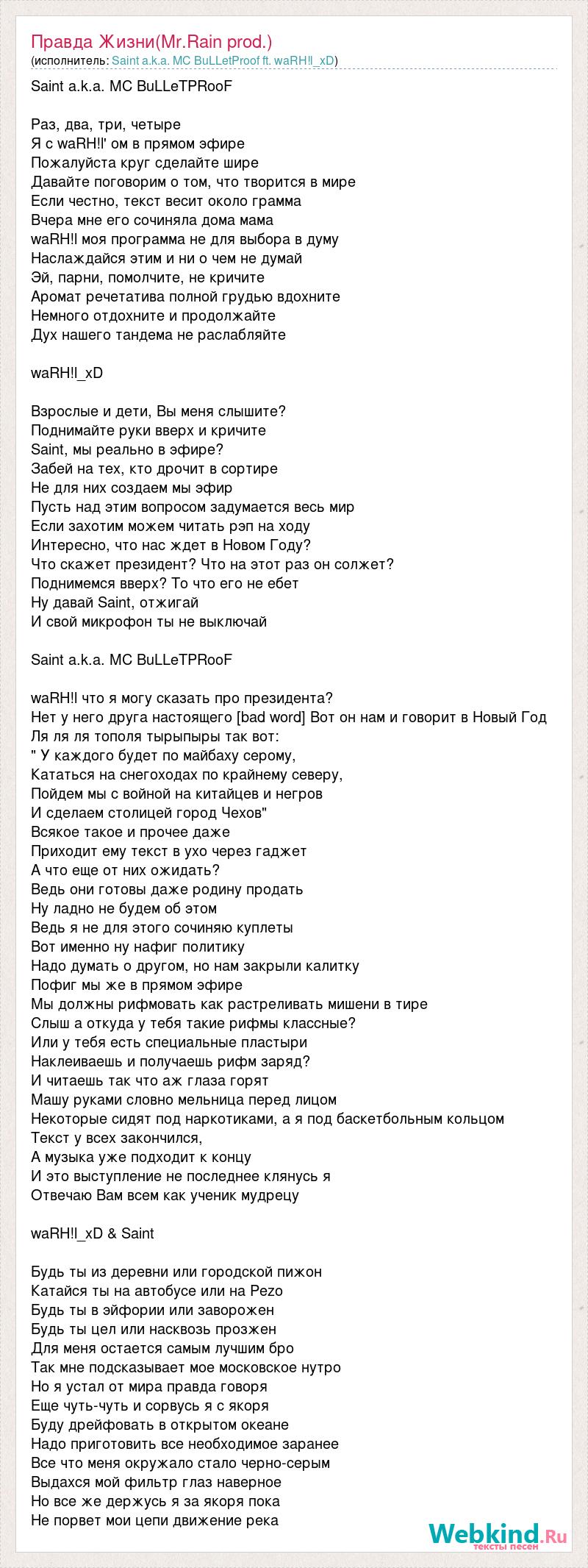 Saint a.k.a. MC BuLLeTPRooF Раз, два, три, четыре Я с waRH!l' ом в прямом эфире Пожалуйста круг сделайте шире Давайте поговорим о том, что творится в мире Если честно, текст весит около грамма Вчера мне его сочиняла дома мама waRH!l моя программа не для выбора в думу Наслаждайся этим и ни о чем не думай Эй, парни, помолчите, не кричите Аромат речетатива полной грудью вдохните Немного отдохните и продолжайте Дух нашего тандема не раслабляйте waRH!l_xD Взрослые и дети, Вы меня слышите? Поднимайте руки вверх и кричите Saint, мы реально в эфире? Забей на тех, кто дрочит в сортире Не для них создаем мы эфир Пусть над этим вопросом задумается весь мир Если захотим можем читать рэп на ходу Интересно, что нас ждет в Новом Году? Что скажет президент? Что на этот раз он солжет? Поднимемся вверх? То что его не ебет Ну давай Saint, отжигай И свой микрофон ты не выключай Saint a.k.a. MC BuLLeTPRooF waRH!l что я могу сказать про президента? Нет у него друга настоящего [bad word] Вот он нам и говорит в Новый Год Ля ля ля тополя тырыпыры так вот: " У каждого будет по майбаху серому, Кататься на снегоходах по крайнему северу, Пойдем мы с войной на китайцев и негров И сделаем столицей город Чехов" Всякое такое и прочее даже Приходит ему текст в ухо через гаджет А что еще от них ожидать? Ведь они готовы даже родину продать Ну ладно не будем об этом Ведь я не для этого сочиняю куплеты Вот именно ну нафиг политику Надо думать о другом, но нам закрыли калитку Пофиг мы же в прямом эфире Мы должны рифмовать как растреливать мишени в тире Слыш а откуда у тебя такие рифмы классные? Или у тебя есть специальные пластыри Наклеиваешь и получаешь рифм заряд? И читаешь так что аж глаза горят Машу руками словно мельница перед лицом Некоторые сидят под наркотиками, а я под баскетбольным кольцом Текст у всех закончился, А музыка уже подходит к концу И это выступление не последнее клянусь я Отвечаю Вам всем как ученик мудрецу waRH!l_xD & Saint Будь ты из деревни или городской пижон Катайся ты на автобусе или на Pezo Будь ты в эйфории или заворожен Будь ты цел или насквозь прозжен Для меня остается самым лучшим бро Так мне подсказывает мое московское нутро Но я устал от мира правда говоря Еще чуть-чуть и сорвусь я с якоря Буду дрейфовать в открытом океане Надо приготовить все необходимое заранее Все что меня окружало стало черно-серым Выдахся мой фильтр глаз наверное Но все же держусь я за якоря пока Не порвет мои цепи движение река