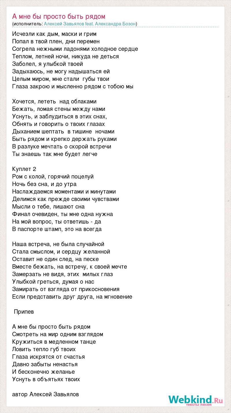 Исчезли как дым, маски и грим Попал в твой плен, дни перемен Согрела нежными ладонями холодное сердце Теплом, летней ночи, никуда не деться Заболел, я улыбкой твоей Задыхаюсь, не могу надышаться ей Целым миром, мне стали губы твои Глаза закрою и мысленно рядом с тобою мы Хочется, лететь над облаками Бежать, ломая стены между нами Уснуть, и заблудиться в этих снах, Обнять и говорить о твоих глазах Дыханием шептать в тишине ночами Быть рядом и крепко держать руками В разлуке мечтать о скорой встречи Ты знаешь так мне будет легче Куплет 2 Ром с колой, горячий поцелуй Ночь без сна, и до утра Наслаждаемся моментами и минутами Делимся как прежде своими чувствами Мысли о тебе, лишают сна Финал очевиден, ты мне одна нужна На мой вопрос, ты ответишь - да В паспорте штамп, это на всегда Наша встреча, не была случайной Стала смыслом, и сердцу желанной Оставит не один след, на песке Вместе бежать, на встречу, к своей мечте Замерзать не видя, этих милых глаз Улыбкой греться, думая о нас Замирать от взгляда от прикосновения Если представить друг друга, на мгновение Припев А мне бы просто быть рядом Смотреть на мир одним взглядом Кружиться в медленном танце Ловить тепло губ твоих Глаза искрятся от счастья Давно забыты ненастья И бесконечно желанье Уснуть в объятьях твоих автор Алексей Завьялов