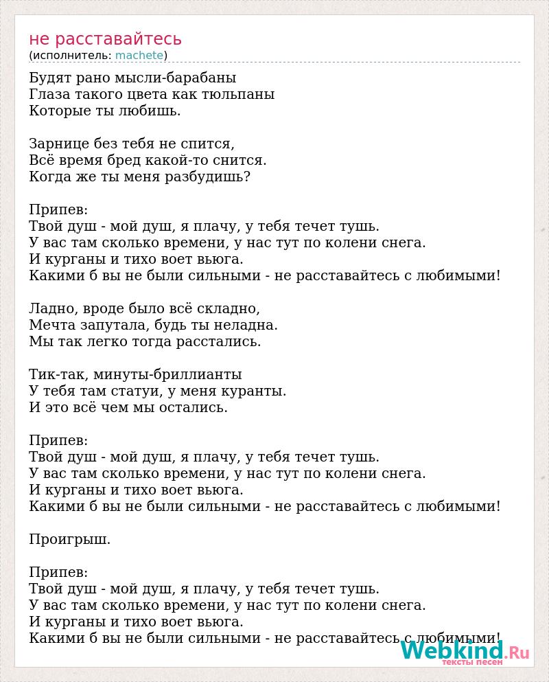 Будят рано мысли-барабаны Глаза такого цвета как тюльпаны Которые ты любишь. Зарнице без тебя не спится, Всё время бред какой-то снится. Когда же ты меня разбудишь? Припев: Твой душ - мой душ, я плачу, у тебя течет тушь. У вас там сколько времени, у нас тут по колени снега. И курганы и тихо воет вьюга. Какими б вы не были сильными - не расставайтесь с любимыми! Ладно, вроде было всё складно, Мечта запутала, будь ты неладна. Мы так легко тогда расстались. Тик-так, минуты-бриллианты У тебя там статуи, у меня куранты. И это всё чем мы остались. Припев: Твой душ - мой душ, я плачу, у тебя течет тушь. У вас там сколько времени, у нас тут по колени снега. И курганы и тихо воет вьюга. Какими б вы не были сильными - не расставайтесь с любимыми! Проигрыш. Припев: Твой душ - мой душ, я плачу, у тебя течет тушь. У вас там сколько времени, у нас тут по колени снега. И курганы и тихо воет вьюга. Какими б вы не были сильными - не расставайтесь с любимыми!