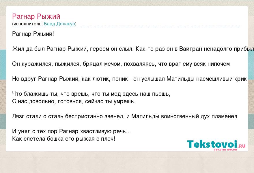 Рагнар Ржыий! Жил да был Рагнар Рыжий, героем он слыл. Как-то раз он в Вайтран ненадолго прибыл Он куражился, пыжился, бряцал мечом, похваляясь, что враг ему всяк нипочем Но вдруг Рагнар Рыжий, как лютик, поник - он услышал Матильды насмешливый крик Что блажишь ты, что врешь, что ты мед здесь наш пьешь, С нас довольно, готовься, сейчас ты умрешь. Лязг стали о сталь беспристанно звенел, и Матильды воинственный дух пламенел И унял с тех пор Рагнар хвастливую речь... Как слетела бошка его рыжая с плеч!