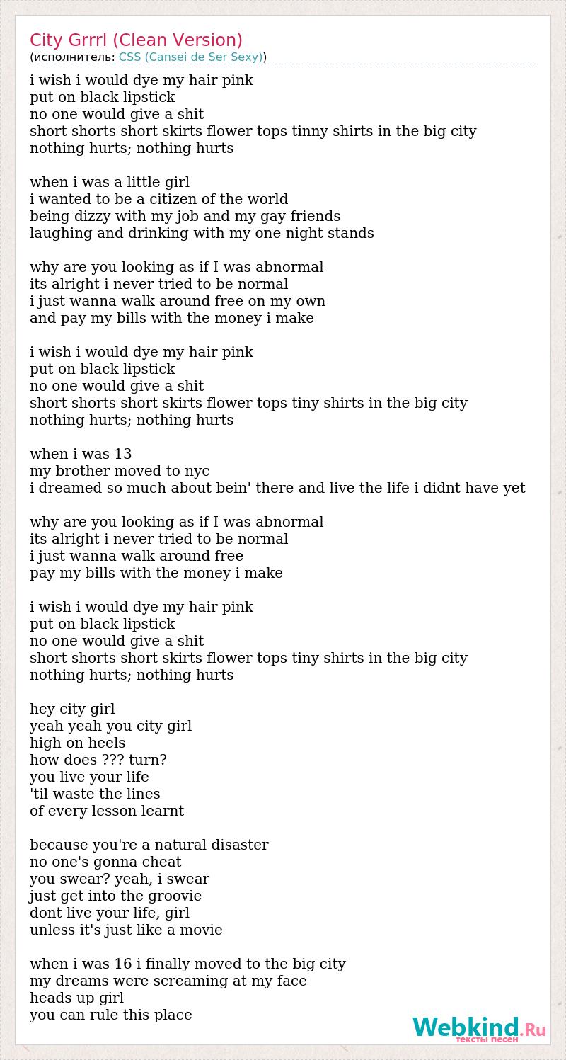 i wish i would dye my hair pink put on black lipstick no one would give a shit short shorts short skirts flower tops tinny shirts in the big city nothing hurts; nothing hurts when i was a little girl i wanted to be a citizen of the world being dizzy with my job and my gay friends laughing and drinking with my one night stands why are you looking as if I was abnormal its alright i never tried to be normal i just wanna walk around free on my own and pay my bills with the money i make i wish i would dye my hair pink put on black lipstick no one would give a shit short shorts short skirts flower tops tiny shirts in the big city nothing hurts; nothing hurts when i was 13 my brother moved to nyc i dreamed so much about bein' there and live the life i didnt have yet why are you looking as if I was abnormal its alright i never tried to be normal i just wanna walk around free pay my bills with the money i make i wish i would dye my hair pink put on black lipstick no one would give a shit short shorts short skirts flower tops tiny shirts in the big city nothing hurts; nothing hurts hey city girl yeah yeah you city girl high on heels how does ??? turn? you live your life 'til waste the lines of every lesson learnt because you're a natural disaster no one's gonna cheat you swear? yeah, i swear just get into the groovie dont live your life, girl unless it's just like a movie when i was 16 i finally moved to the big city my dreams were screaming at my face heads up girl you can rule this place