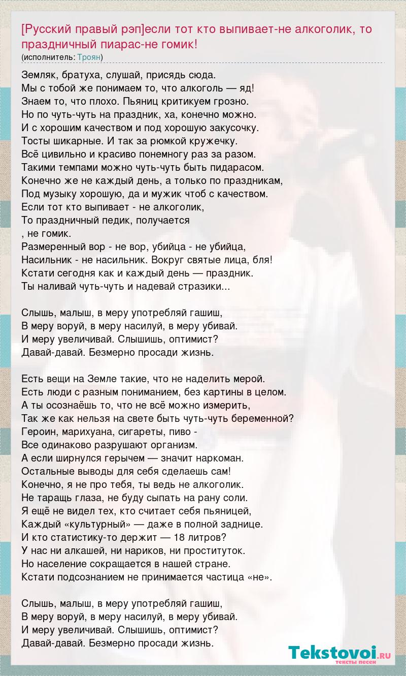 Главная→Исполнители→Троян→[Русский правый рэп]если тот кто выпивает-не алкоголик, то праздничный пиарас-не