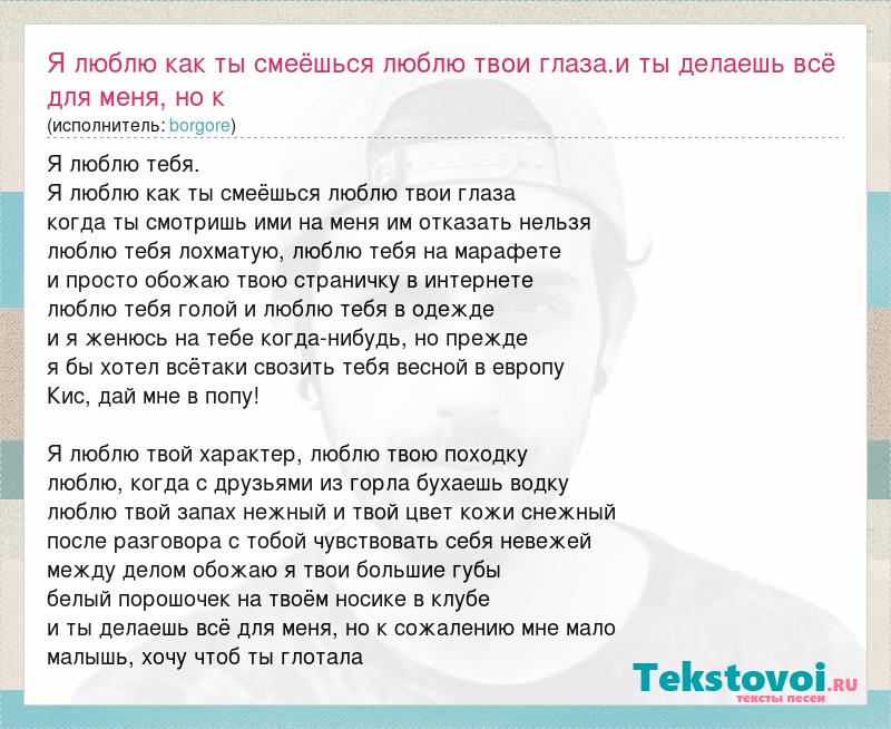 Главная→Исполнители→Borgore→Я люблю как ты смеёшься люблю твои глаза.и ты делаешь всё для меня, но к