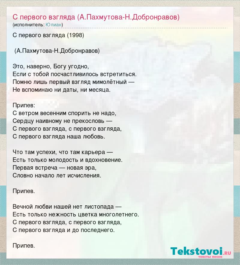 С первого взгляда (1998) (А.Пахмутова-Н.Добронравов) Это, наверно, Богу угодно, Если с тобой посчастливилось встретиться. Помню лишь первый взгляд мимолётный — Не вспоминаю ни даты, ни месяца. Припев: С ветром весенним спорить не надо, Сердцу наивному не прекословь — С первого взгляда, с первого взгляда, С первого взгляда наша любовь. Что там успехи, что там карьера — Есть только молодость и вдохновение. Первая встреча — новая эра, Словно начало лет исчисления. Припев. Вечной любви нашей нет листопада — Есть только нежность цветка многолетнего. С первого взгляда, с первого взгляда, С первого взгляда и до последнего. Припев.
