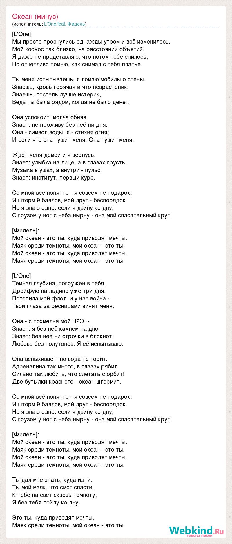 [L'One]: Мы просто проснулись однажды утром и всё изменилось. Мой космос так близко, на расстоянии объятий. Я даже не представляю, что потом тебе снилось, Но отчетливо помню, как снимал с тебя платье. Ты меня испытываешь, я ломаю мобилы о стены. Знаешь, кровь горячая и что неврастеник. Знаешь, постель лучше истерик, Ведь ты была рядом, когда не было денег. Она успокоит, молча обняв. Знает: не проживу без неё ни дня. Она - символ воды, я - стихия огня; И если что она тушит меня. Она тушит меня. Ждёт меня домой и я вернусь. Знает: улыбка на лице, а в глазах грусть. Музыка в ушах, а внутри - пульс, Знает: институт, первый курс. Со мной все понятно - я совсем не подарок; Я шторм 9 баллов, мой друг - беспорядок. Но я знаю одно: если я двину ко дну, С грузом у ног с неба нырну - она мой спасательный круг! [Фидель]: Мой океан - это ты, куда приводят мечты. Маяк среди темноты, мой океан - это ты! Мой океан - это ты, куда приводят мечты. Маяк среди темноты, мой океан - это ты! [L'One]: Темная глубина, погружен в тебя, Дрейфую на льдине уже три дня. Потопила мой флот, и у нас война - Твои глаза за ресницами винят меня. Она - с похмелья мой H2O. - Знает: я без неё камнем на дно. Знает: без неё ни строчки в блокнот, Любовь без полутонов. Я её испытываю. Она вспыхивает, но вода не горит. Адреналина так много, в глазах рябит. Сильно так любить, что слетать с орбит! Две бутылки красного - океан штормит. Со мной всё понятно - я совсем не подарок; Я шторм 9 баллов, мой друг - беспорядок. Но я знаю одно: если я двину ко дну, С грузом у ног с неба нырну - она мой спасательный круг! [Фидель]: Мой океан - это ты, куда приводят мечты. Маяк среди темноты, мой океан - это ты. Мой океан - это ты, куда приводят мечты. Маяк среди темноты, мой океан - это ты. Ты дал мне знать, куда идти. Ты мой маяк, что смог спасти. К тебе на свет сквозь темноту; Я без тебя пойду ко дну. Это ты, куда приводят мечты. Маяк среди темноты, мой океан - это ты.