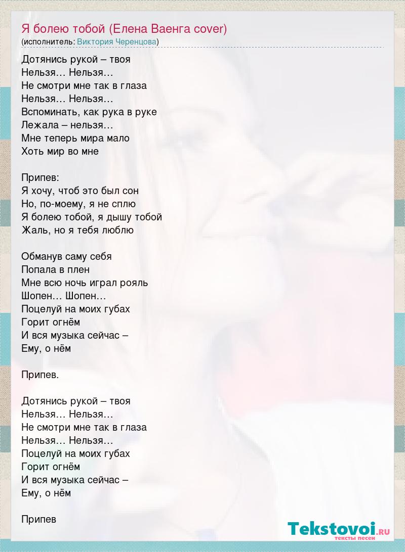 Дотянись рукой – твоя Нельзя… Нельзя… Не смотри мне так в глаза Нельзя… Нельзя… Вспоминать, как рука в руке Лежала – нельзя… Мне теперь мира мало Хоть мир во мне Припев: Я хочу, чтоб это был сон Но, по-моему, я не сплю Я болею тобой, я дышу тобой Жаль, но я тебя люблю Обманув саму себя Попала в плен Мне всю ночь играл рояль Шопен… Шопен… Поцелуй на моих губах Горит огнём И вся музыка сейчас – Ему, о нём Припев. Дотянись рукой – твоя Нельзя… Нельзя… Не смотри мне так в глаза Нельзя… Нельзя… Поцелуй на моих губах Горит огнём И вся музыка сейчас – Ему, о нём Припев