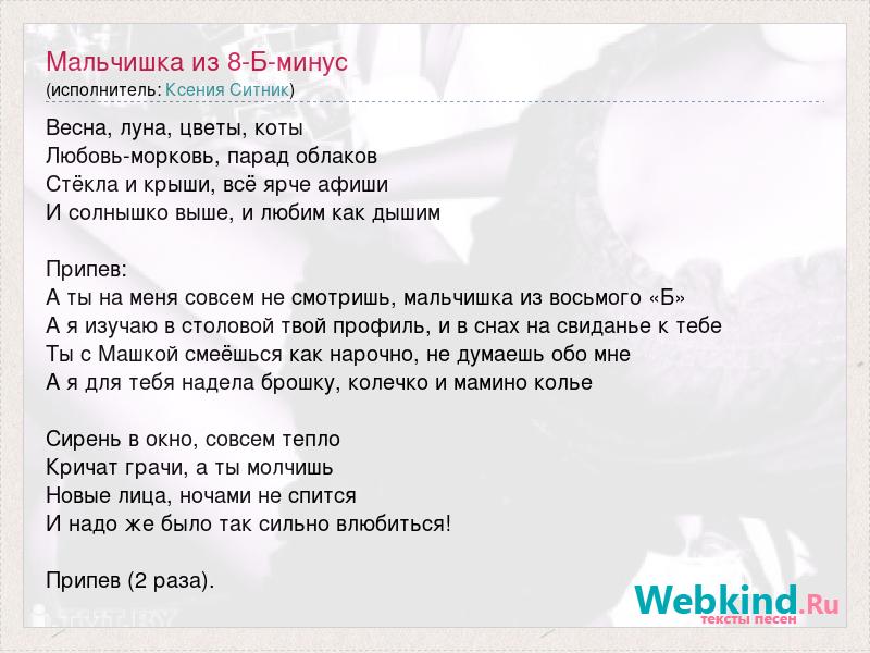 Весна, луна, цветы, коты Любовь-морковь, парад облаков Стёкла и крыши, всё ярче афиши И солнышко выше, и любим как дышим Припев: А ты на меня совсем не смотришь, мальчишка из восьмого «Б» А я изучаю в столовой твой профиль, и в снах на свиданье к тебе Ты с Машкой смеёшься как нарочно, не думаешь обо мне А я для тебя надела брошку, колечко и мамино колье Сирень в окно, совсем тепло Кричат грачи, а ты молчишь Новые лица, ночами не спится И надо же было так сильно влюбиться! Припев (2 раза).