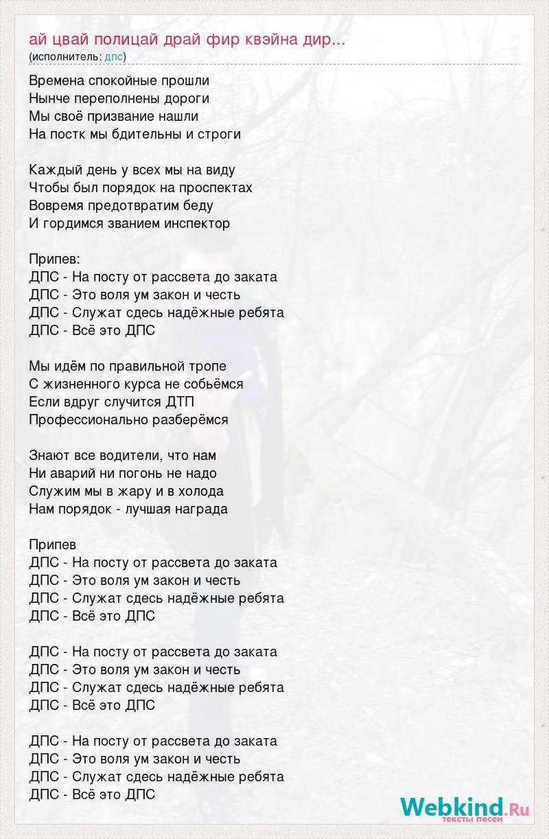 Времена спокойные прошли Нынче переполнены дороги Мы своё призвание нашли На постк мы бдительны и строги Каждый день у всех мы на виду Чтобы был порядок на проспектах Вовремя предотвратим беду И гордимся званием инспектор Припев: ДПС - На посту от рассвета до заката ДПС - Это воля ум закон и честь ДПС - Служат сдесь надёжные ребята ДПС - Всё это ДПС Мы идём по правильной тропе С жизненного курса не собьёмся Если вдруг случится ДТП Профессионально разберёмся Знают все водители, что нам Ни аварий ни погонь не надо Служим мы в жару и в холода Нам порядок - лучшая награда Припев ДПС - На посту от рассвета до заката ДПС - Это воля ум закон и честь ДПС - Служат сдесь надёжные ребята ДПС - Всё это ДПС ДПС - На посту от рассвета до заката ДПС - Это воля ум закон и честь ДПС - Служат сдесь надёжные ребята ДПС - Всё это ДПС ДПС - На посту от рассвета до заката ДПС - Это воля ум закон и честь ДПС - Служат сдесь надёжные ребята ДПС - Всё это ДПС
