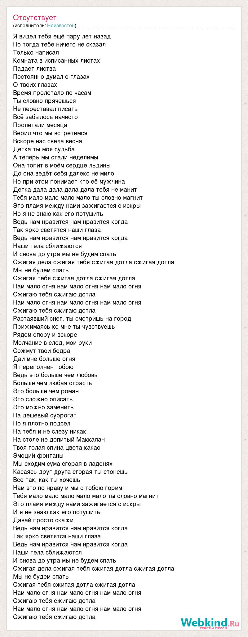 Я видел тебя ещё пару лет назад Но тогда тебе ничего не сказал Только написал Комната в исписанных листах Падает листва Постоянно думал о глазах О твоих глазах Время пролетало по часам Ты словно прячешься Не переставал писать Всё забылось начисто Пролетали месяца Верил что мы встретимся Вскоре нас свела весна Детка ты моя судьба А теперь мы стали неделимы Она топит в моём сердце льдины До она ведёт себя далеко не мило Но при этом понимает кто её мужчина Детка дала дала дала дала тебя не манит Тебя мало мало мало мало ты словно магнит Это пламя между нами зажигается с искры Но я не знаю как его потушить Ведь нам нравится нам нравится когда Так ярко светятся наши глаза Ведь нам нравится нам нравится когда Наши тела сближаются И снова до утра мы не будем спать Сжигая дела сжигая тебя сжигая дотла сжигая дотла Мы не будем спать Сжигая тебя сжигая дотла сжигая дотла Нам мало огня нам мало огня нам мало огня Сжигаю тебя сжигаю дотла Нам мало огня нам мало огня нам мало огня Сжигаю тебя сжигаю дотла Растаявший снег, ты смотришь на город Прижимаясь ко мне ты чувствуешь Рядом опору и вскоре Молчание в след, мои руки Сожмут твои бедра Дай мне больше огня Я переполнен тобою Ведь это больше чем любовь Больше чем любая страсть Это больше чем роман Это сложно описать Это можно заменить На дешевый суррогат Но я плотно подсел На тебя и не слезу никак На столе не допитый Маккалан Твоя голая спина цвета какао Эмоций фонтаны Мы сходим сума сгорая в ладонях Касаясь друг друга сгорая ты стонешь Все так, как ты хочешь Нам это по нраву и мы с тобою горим Тебя мало мало мало мало мало ты словно магнит Это пламя между нами зажигается с искры И я не знаю как его потушить Давай просто скажи Ведь нам нравится нам нравится когда Так ярко светятся наши глаза Ведь нам нравится нам нравится когда Наши тела сближаются И снова до утра мы не будем спать Сжигая дела сжигая тебя сжигая дотла сжигая дотла Мы не будем спать Сжигая тебя сжигая дотла сжигая дотла Нам мало огня нам мало огня нам мало огня Сжигаю тебя сжигаю дотла Нам мало огня нам мало огня нам мало огня Сжигаю тебя сжигаю дотла