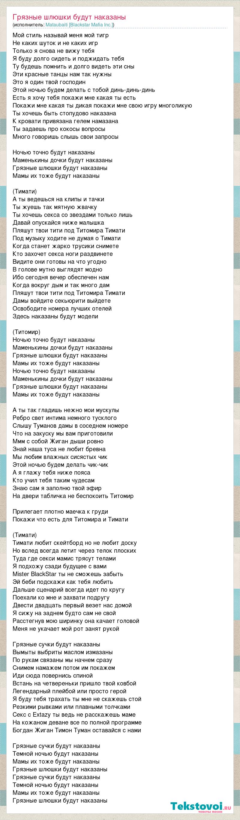 Мой стиль называй меня мой тигр Не каких шуток и не каких игр Только я снова не вижу тебя Я буду долго сидеть и поджидать тебя Ту будешь помнить и долго видеть эти сны Эти красные танцы нам так нужны Это я один твой господин Этой ночью будем делать с тобой динь-динь-динь Есть я хочу тебя покажи мне какая ты есть Покажи мне какая ты дикая покажи мне свою игру многоликую Ты хочешь быть стопудово наказана К кровати привязана гелем намазана Ты задаешь про кокосы вопросы Много говоришь слышь свои запросы Ночью точно будут наказаны Маменькины дочки будут наказаны Грязные шлюшки будут наказаны Мамы их тоже будут наказаны (Тимати) А ты ведешься на клипы и тачки Ты жуешь так мятную жвачку Ты хочешь секса со звездами только лишь Давай опускайся ниже малышка Пляшут твои тити под Титомира Тимати Под музыку ходите не думая о Тимати Когда станет жарко трусики снимете Кто захочет секса ноги раздвинете Видите они готовы на что угодно В голове мутно выглядят модно Ибо сегодня вечер обеспечен нам Когда вокруг дым и так много дам Пляшут твои тити под Титомира Тимати Дамы войдите секьюрити выйдете Освободите номера лучших отелей Здесь наказаны будут модели (Титомир) Ночью точно будут наказаны Маменькины дочки будут наказаны Грязные шлюшки будут наказаны Мамы их тоже будут наказаны Ночью точно будут наказаны Маменькины дочки будут наказаны Грязные шлюшки будут наказаны Мамы их тоже будут наказаны А ты так гладишь нежно мои мускулы Ребро свет интима немного тусклого Слышу Туманов дамы в соседнем номере Что на закуску мы вам приготовили Ммм с собой Жиган дыши ровно Знай наша туса не любит бревна Мы любим влажных сисястых чик Этой ночью будем делать чик-чик А я глажу тебя ниже пояса Кто учил тебя таким чудесам Знаю сам я заполню твой эфир На двери табличка не беспокоить Титомир Прилегает плотно маечка к груди Покажи что есть для Титомира и Тимати (Тимати) Тимати любит скейтборд но не любит доску Но вслед всегда летит через телок плоских Туда где секси мамис трясут телами Я подхожу сзади будущее с вами Mister BlackStar ты не сможешь забыть Эй беби подскажи как тебя любить Дальше сценарий всегда идет по кругу Поехали ко мне и захвати подругу Двести двадцать первый везет нас домой Я сижу на заднем будто сам не свой Расстегнув мою ширинку она качает головой Меня не укачает мой рот занят рукой Грязные сучки будут наказаны Вымыты выбриты маслом измазаны По рукам связаны мы начнем сразу Снимем намажем потом им покажем Иди сюда повернись спиной Встань на четвереньки пришло твой ковбой Легендарный плейбой или просто герой Я буду тебя трахать ты мне не скажешь стой Резкими рывками или плавными толчками Секс с Extazy ты ведь не расскажешь маме На кожаном деване все по полной программе Богдан Жиган Тимон Туман оставайся с нами Грязные сучки будут наказаны Темной ночью будут наказаны Мамы их тоже будут наказаны Грязные шлюшки будут наказаны Грязные сучки будут наказаны Темной ночью будут наказаны Мамы их тоже будут наказаны Грязные шлюшки будут наказаны