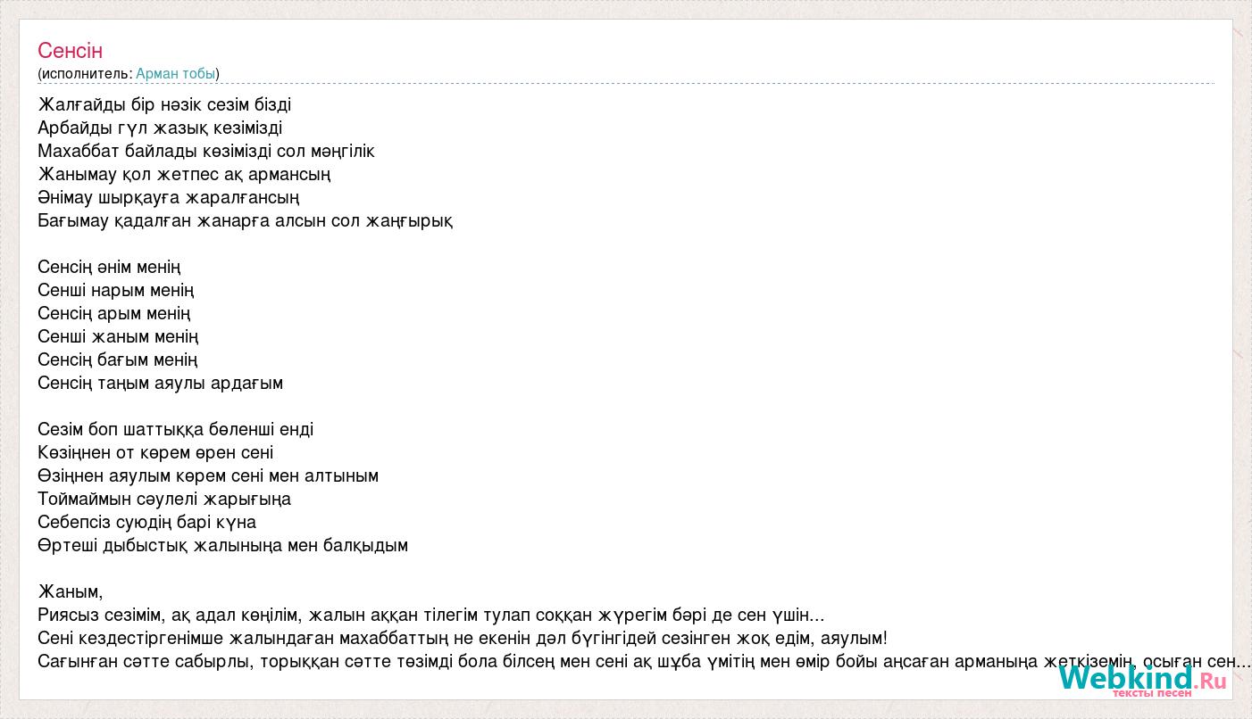 Жалғайды бір нәзік сезім бізді Арбайды гүл жазық кезімізді Махаббат байлады көзімізді сол мәңгілік Жанымау қол жетпес ақ армансың Әнімау шырқауға жаралғансың Бағымау қадалған жанарға алсын сол жаңғырық Сенсің әнім менің Сенші нарым менің Сенсің арым менің Сенші жаным менің Сенсің бағым менің Сенсің таңым аяулы ардағым Сезім боп шаттыққа бөленші енді Көзіңнен от көрем өрен сені Өзіңнен аяулым көрем сені мен алтыным Тоймаймын сәулелі жарығыңа Себепсіз суюдің барі күна Өртеші дыбыстық жалыныңа мен балқыдым Жаным, Риясыз сезімім, ақ адал көңілім, жалын аққан тілегім тулап соққан жүрегім бәрі де сен үшін... Сені кездестіргенімше жалындаған махаббаттың не екенін дәл бүгінгідей сезінген жоқ едім, аяулым! Сағынған сәтте сабырлы, торыққан сәтте төзімді бола білсең мен сені ақ шұба үмітің мен өмір бойы аңсаған арманыңа жеткіземін, осыған сен...